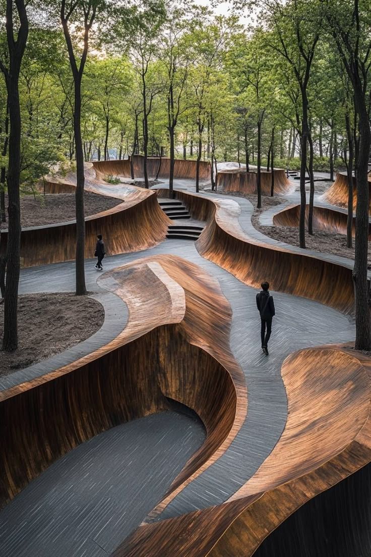 sarineen aerial shot make it designed with more curvy line wood nature concept with open spaces remove the person add old people architecture