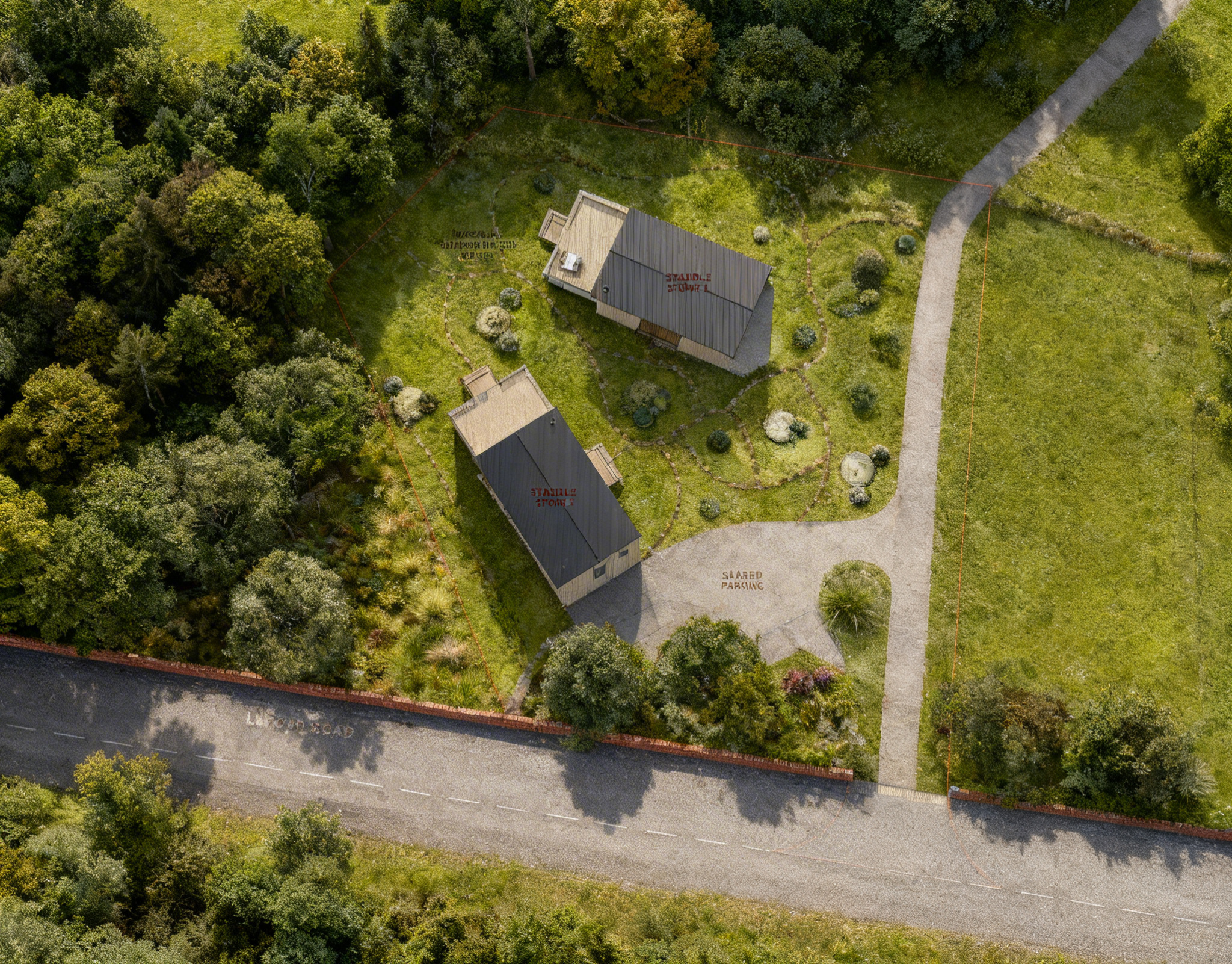 follow the plan design exact this has no bricks and no stairs place palm trees behind the house make house white with balck roof and black trim and black trim around windows with exact same black doors add drove way to the left and right side of house