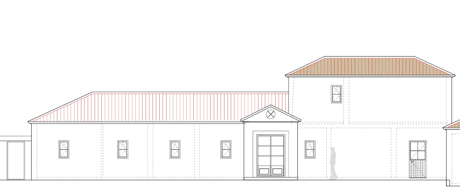 traditional style spanish farm window frames and door frame with glass panels sage green traditional spanish roof tiles foreground cobble paving with decorative pots along the facde circular opening with metal devisions walls off white entrance plaster band white