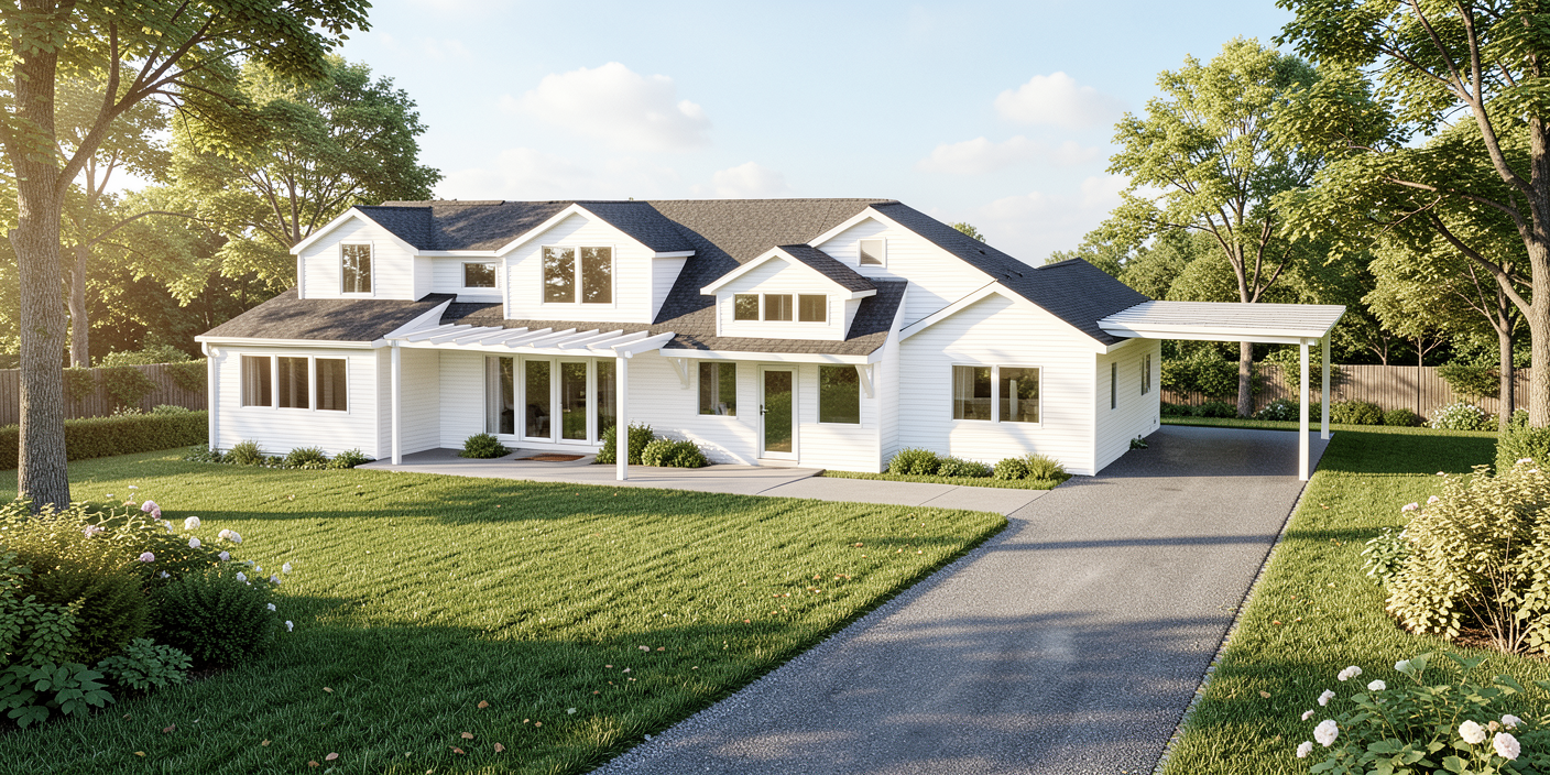 ultra realistic high resolution architectural photograph based exactly on the geometry and composition of uploaded sketchup image the main building must be focused with the clear lighting buff facing brickwork with the black frame metal roof covering and timber fence on the back standing seam metal remove any unwanted lines from the elevation all the materials in the sketch turn into realistic texture under soft light keep the environment very similar in the image make soft professional architectural style photography with no changing or adding any element highly detailed textures 4k resolution with wide angle view