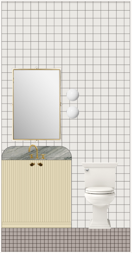interior shot change the knobs to sphere khaki knobs change the sconce to two individual sconces make the vanity touch the side wall make the countertop less mint color more grey green undertone make the floor tile less saturated and soft brown