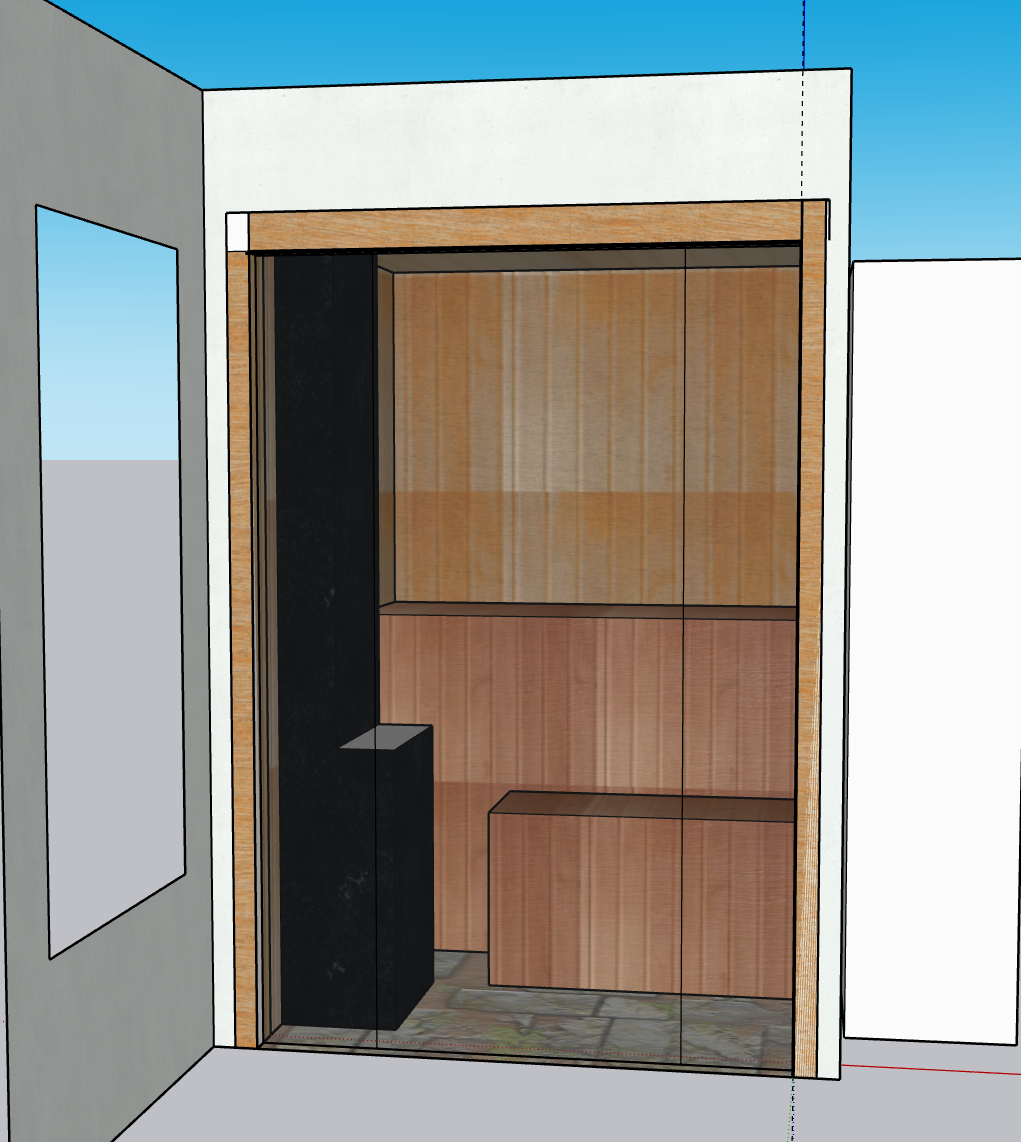 make this a realistic looking sauna beautiful do not change scale or structure tranquil cedar sauna with led underglow downlight red light therapy in ceiling fixed glass panel on either side with operable middle door reflective glass beautufil
