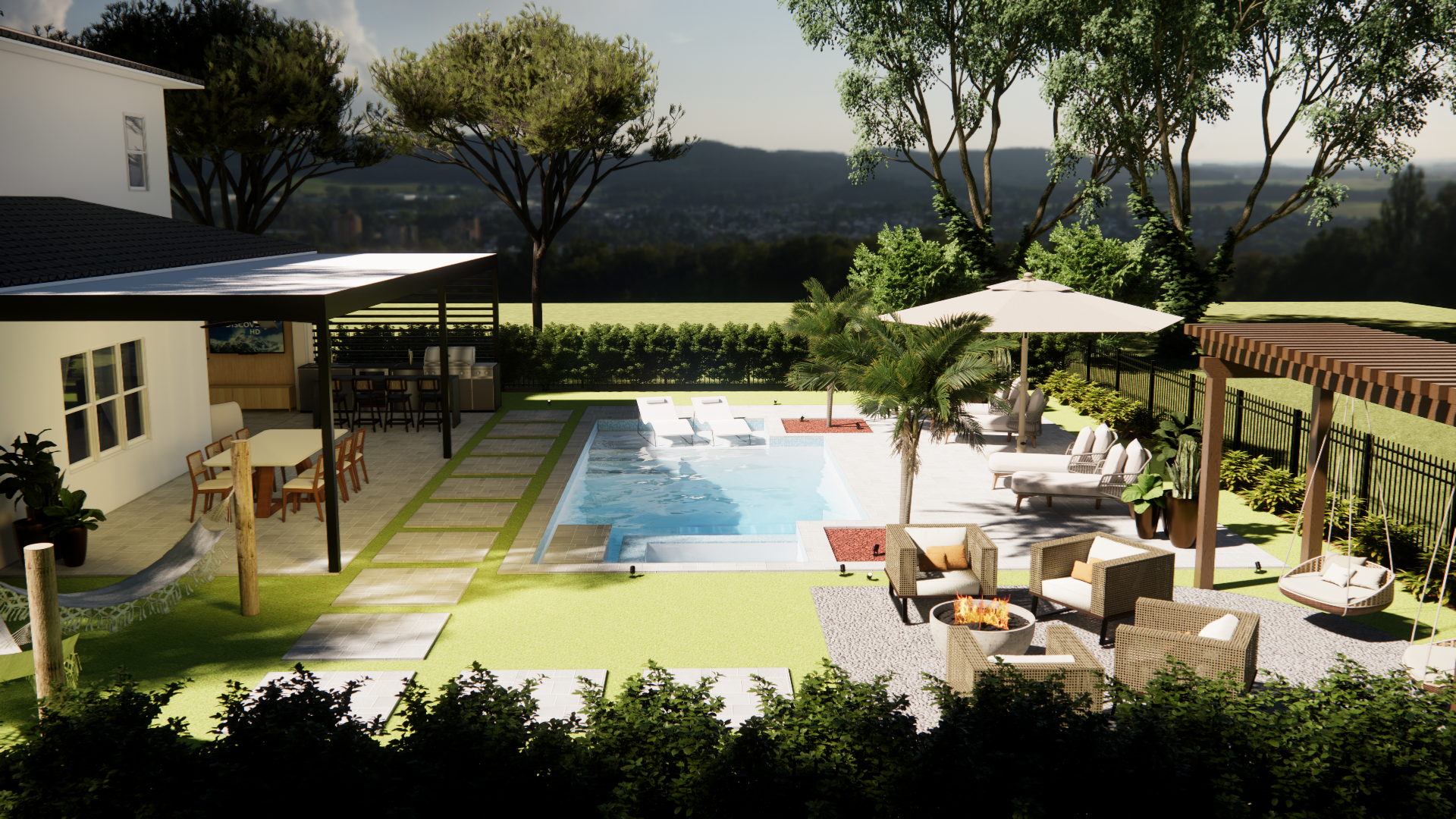 create a realistic animated video from the attached image add a slow cinematic zoom in camera movement smooth and steady animate the fire pit with natural realistic flame movement and subtle glow animate the swimming pool water with realistic ripples and soft movement add two children playing in the pool creating natural splashes and water interaction add two adults relaxing inside the spa area partially submerged with subtle natural body movement use warm golden hour lighting with soft shadows and realistic reflections keep everything ultra realistic high end architectural visualization style 4k quality natural human motion no exaggerated animation