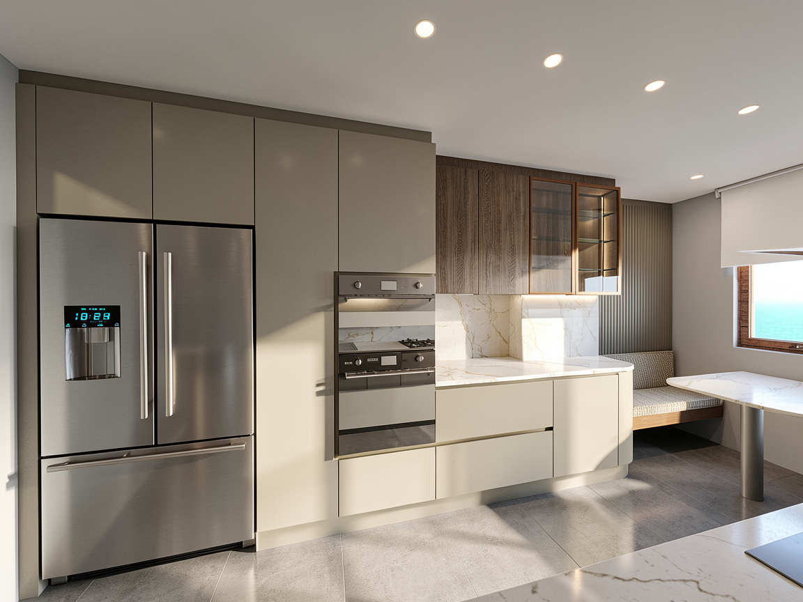 victorian exterior shot create a high quality photorealistic render from a simple g 1 box type massing model strictly keep the original building shape proportions and openings unchanged do not redesign the structure only enhance materials and fa ade apply an ultra modern luxury theme use a controlled palette white textured plaster dark grey stone cladding and warm wood panels add large realistic aluminium framed windows with proper proportions not oversized or distorted provide a clean glass or metal balcony railing add subtle horizontal and vertical grooves to create depth enhance realism add a modern entrance door with a simple portal frame include soft landscape grass pathway minimal plants maintain realistic construction detailing no futuristic or impractical elements lighting and view use warm evening golden hour lighting with soft shadows eye level human perspective slight corner angle avoid overexposure avoid dramatic or unrealistic effects important keep design buildable and cost realistic do not add extra floors curves or complex shapes do not change massing only upgrade appearance architecture