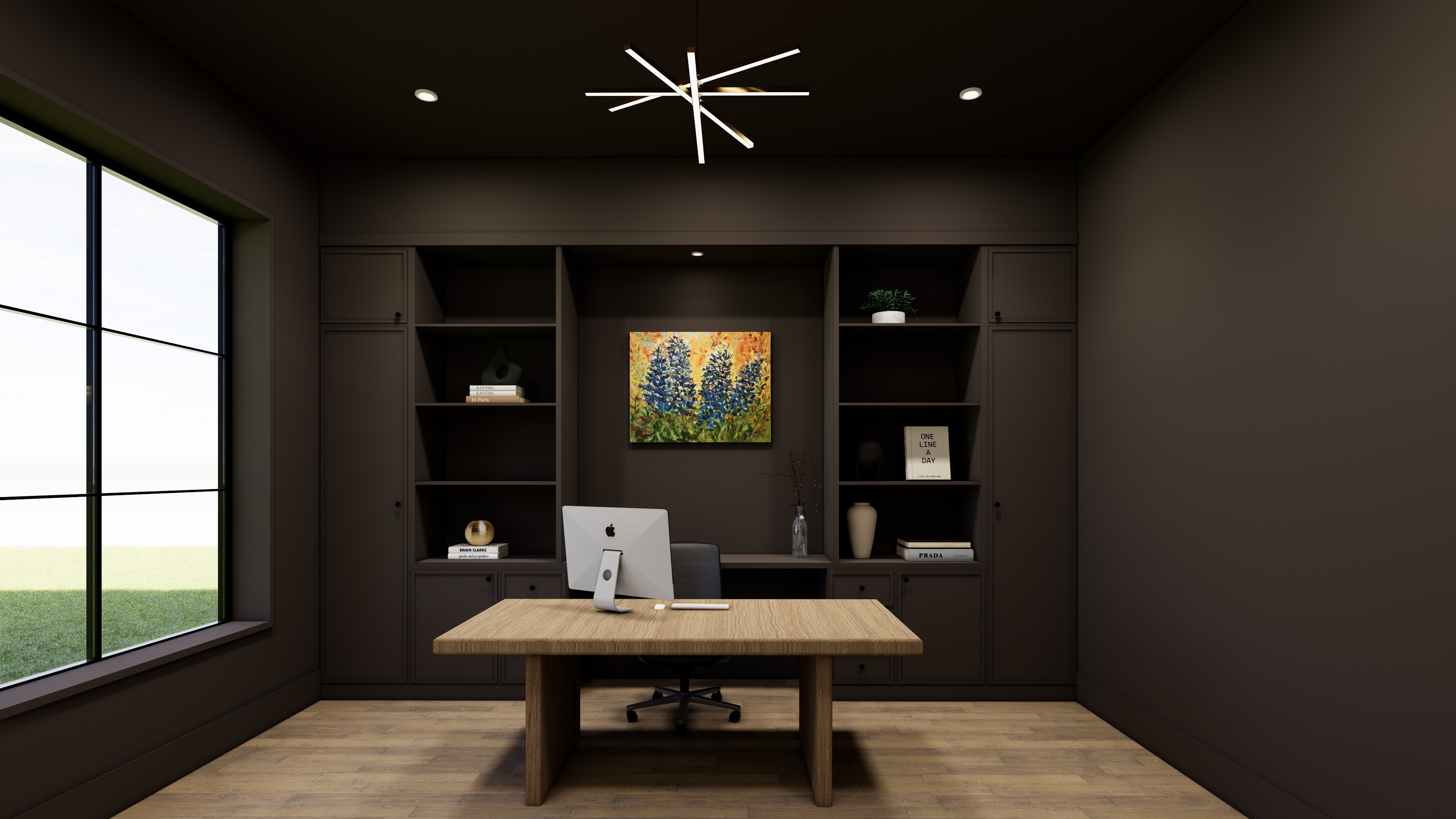 replace the desk to be rounded and light oak also change the painting to a abstract neutral panting and change the chair