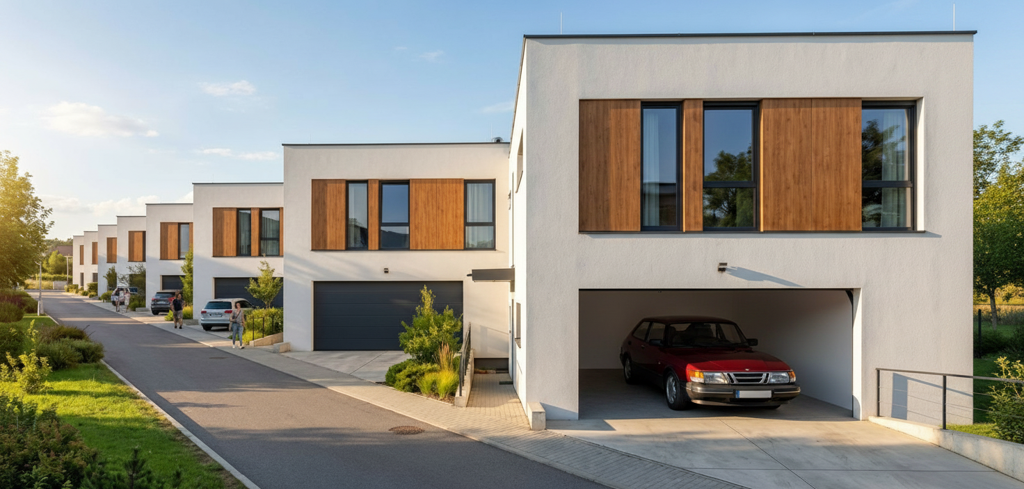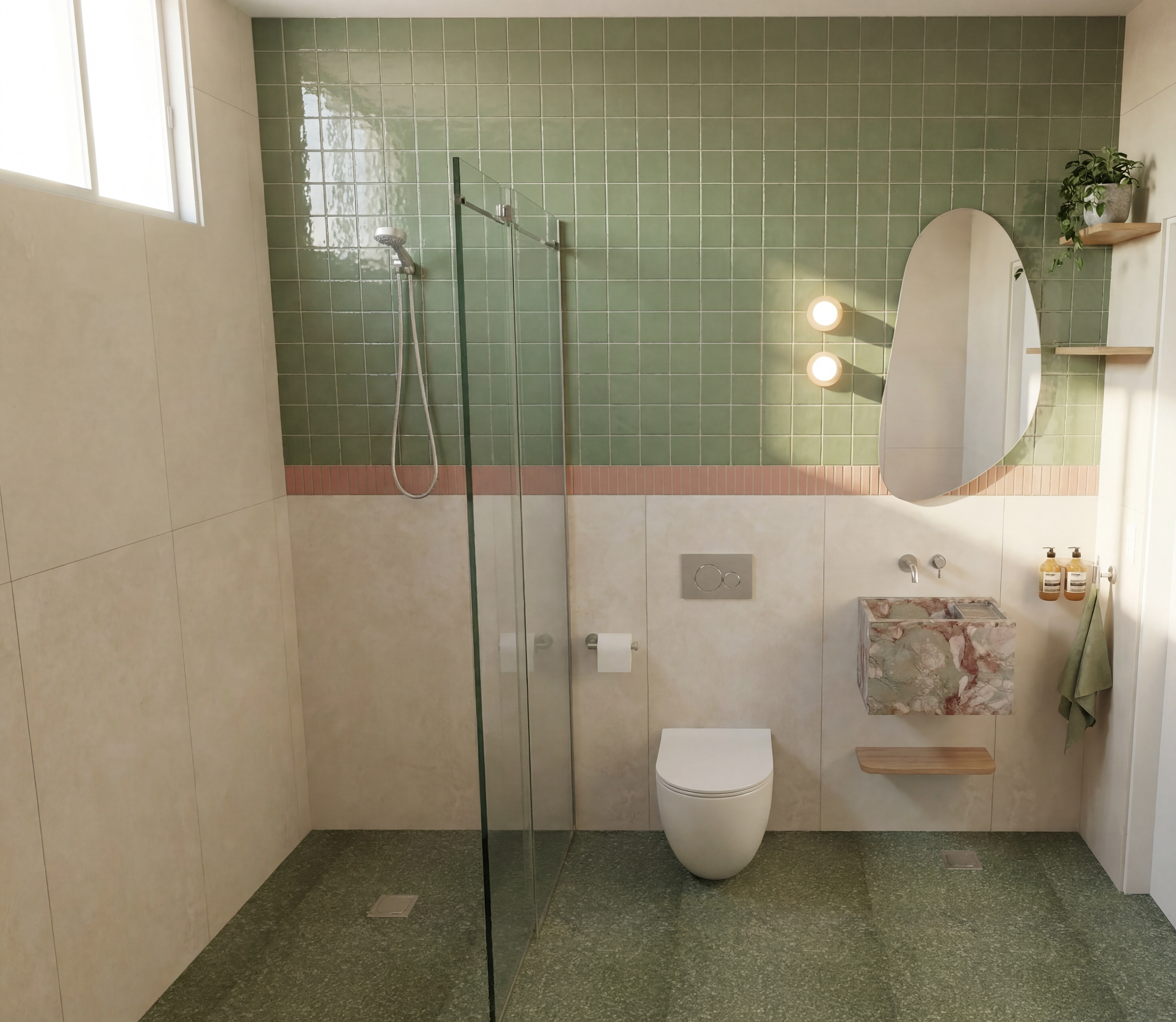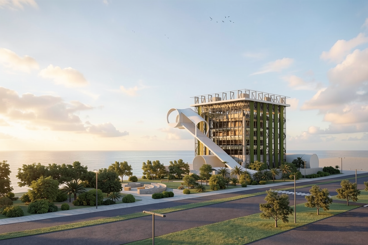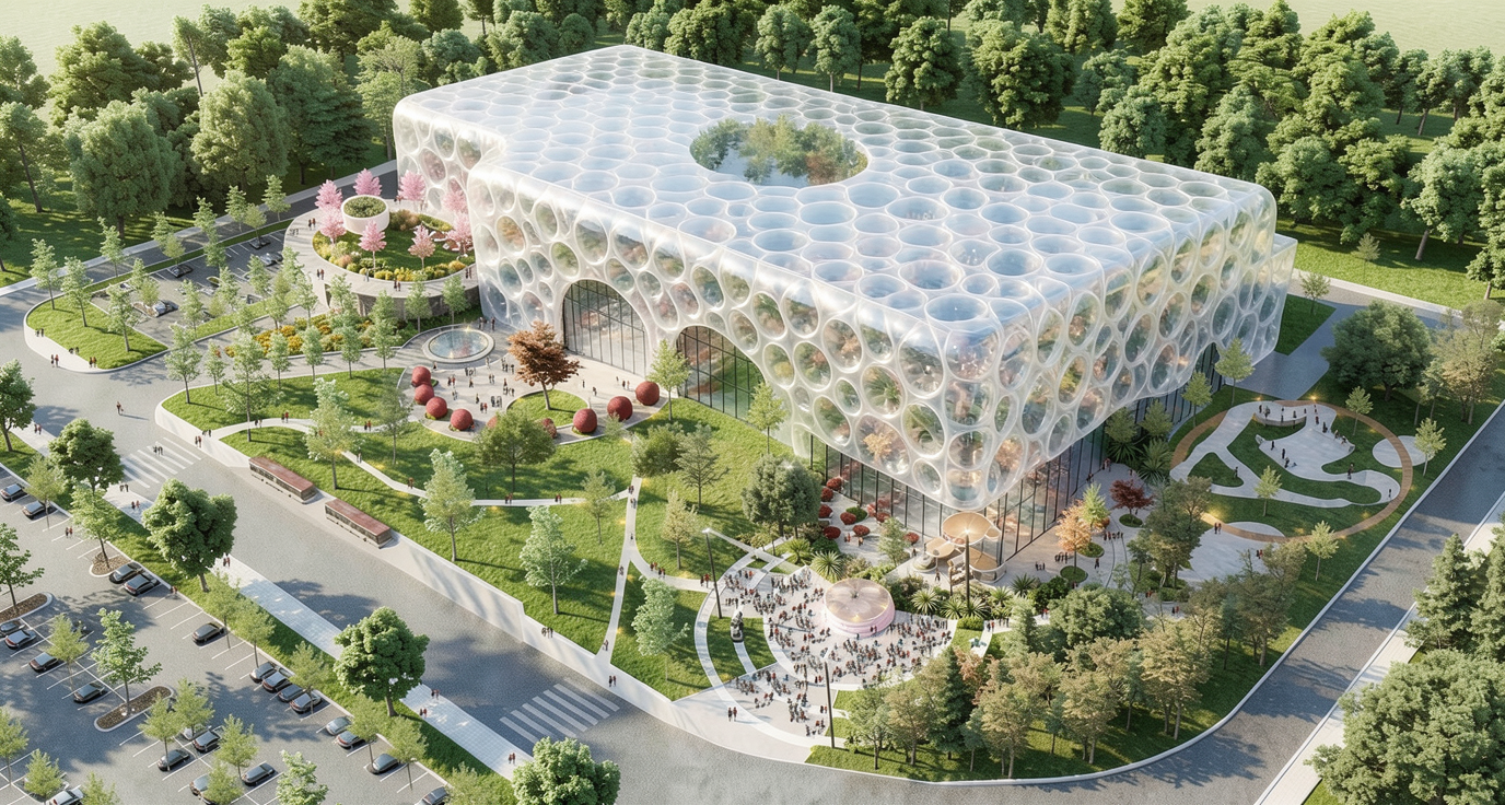 a high resolution architectural render of a large public building featuring a soft translucent bubble fa ade wrapping the entire volume retain the context surrounding landscape and outdoor setting the building mass is a simple solid rectangular prism with slightly softened edges and corners allowing the bubble geometry to flow continuously across all faces including corners no sharp rigid edges the fa ade consists of irregular organic small dense connected hexagonal cells with varying sizes appearing very slightly inflated and seamlessly attached creating a natural fluid pattern across the surface material is white translucent polycarbonate with subtle reflections light diffusion and internal glow allowing light to pass through realistically the ground floor is recessed creating a shadow gap so the building appears to float above a transparent base similar to the water cube the recessed level includes glass curtain walls the fa ade begins above this recessed plinth level remove all excess circular perforations remove domes and skylights maintain a balance between solid mass and selective voids surroundings include a landscaped public plaza soft greenery pathways and people for scale style highly realistic architectural visualization clean minimal contemporary parametric design language
