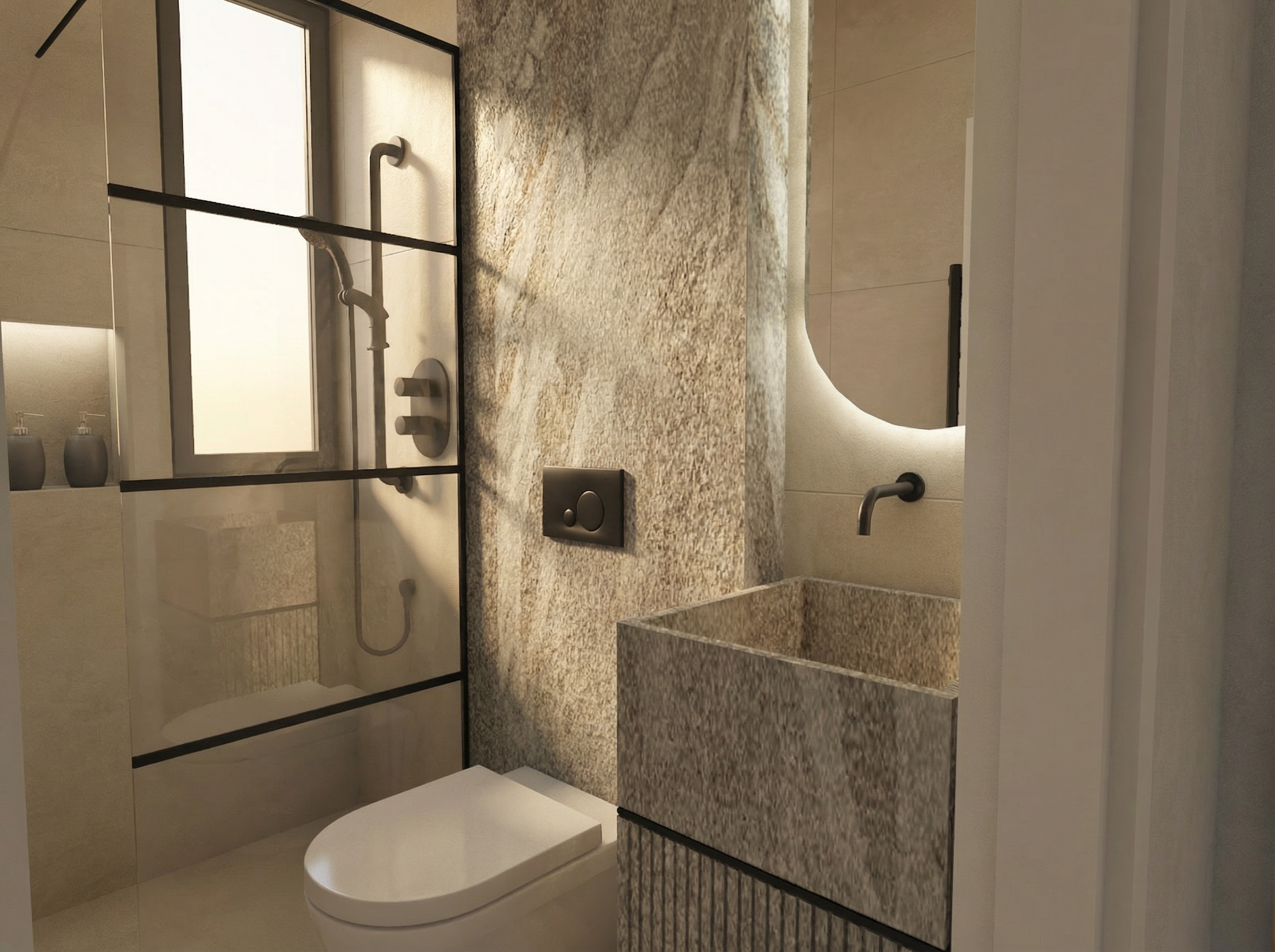 change the wall tiles except from those behind the toilet and the sink to beige 60x120 tiles behind the toilet i want to be exacly like the sink like tile 60x120 and not like stone