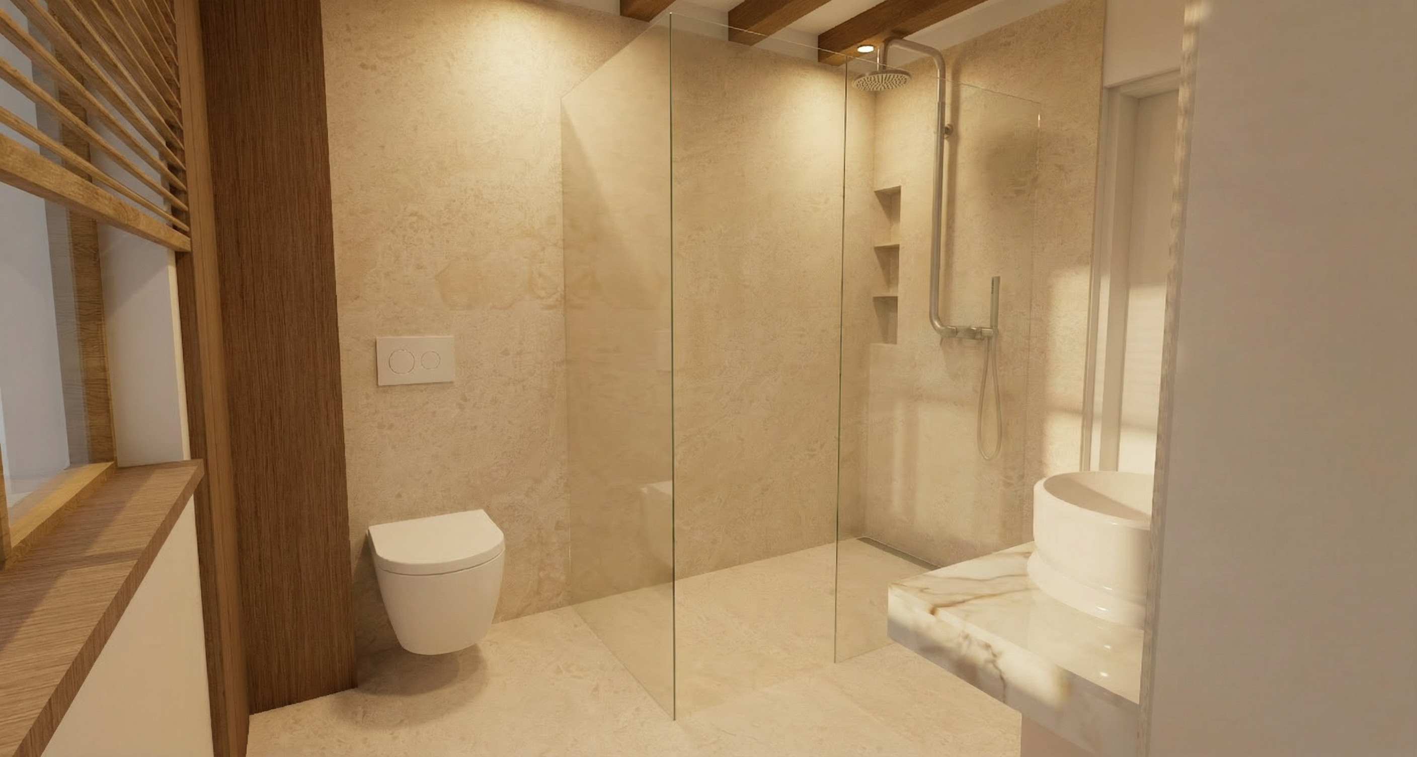 conjunto de tres esferas cer micas con textura rugosa y un peque o agujero circular en la parte superior son de colores blanco crema y terracota est n situadas sobre una peana con un plano inclinado de color blanco las paredes y el techo son blancos y el techo es de tarima de roble con las tablas paralelas a la pared donde se sit an las esferas la luz es puntual sobre cada una de las esferas y el resto de la estancia est en una cierta penumbra