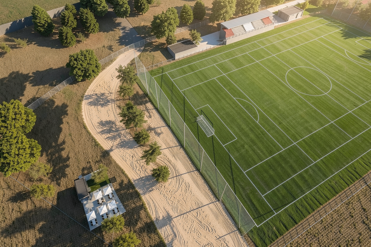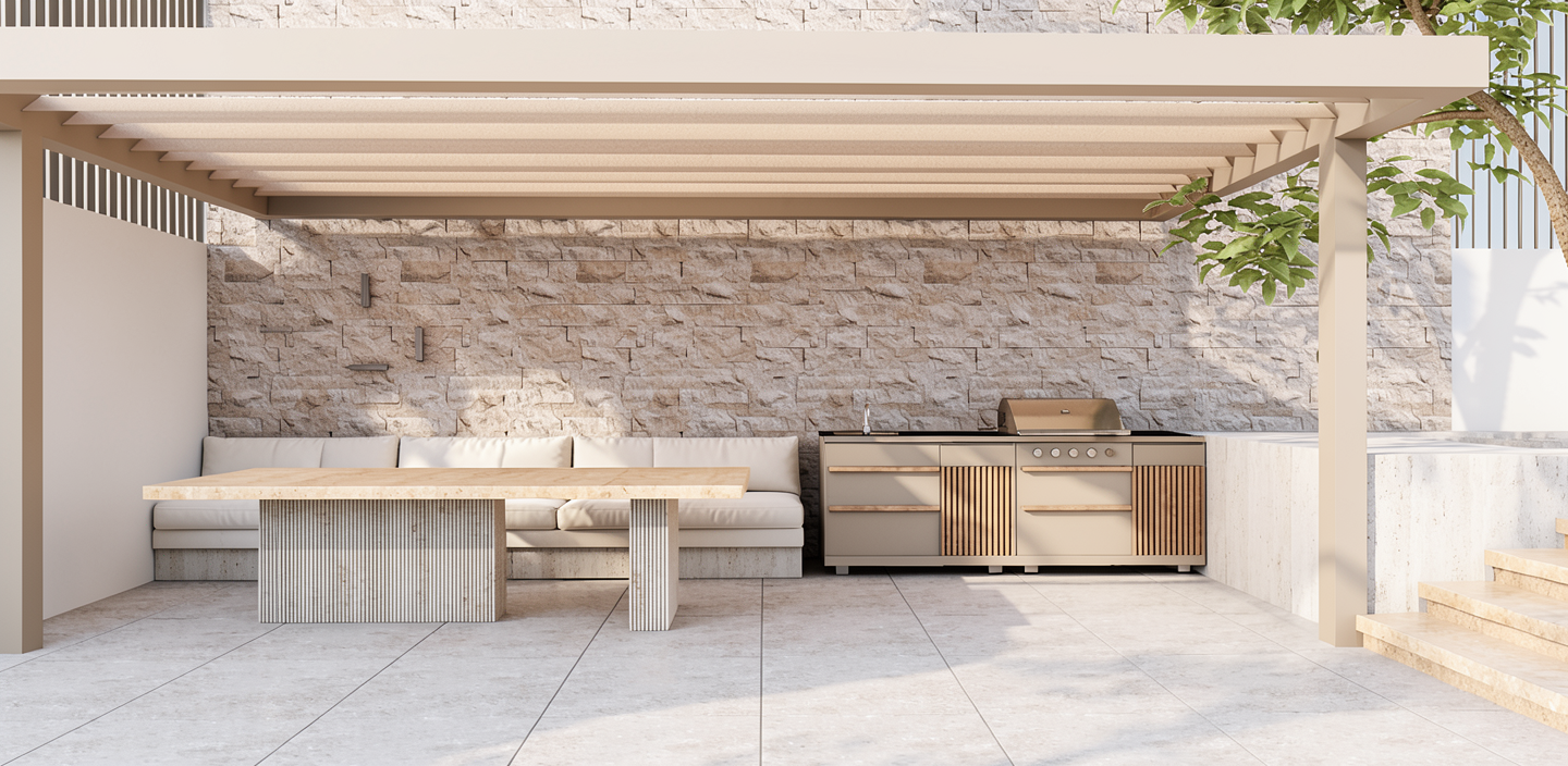 as a continuation of the exterior fa ade this area features an outdoor living and dining space with a travertine dining table as the central element a pergola in a soft sand tone is positioned above providing shade while maintaining the light neutral aesthetic of the composition behind the main view a built in sofa is integrated into the structure finished with off white waterproof cushions arranged in a clean and elegant manner on the right side there is a built in bbq in a beige finish detailed with linear wooden handles as shown in the reference stone on the wall behind the bbq and sofa on this wall there are 4 white linear sconces on the right side which are lighting