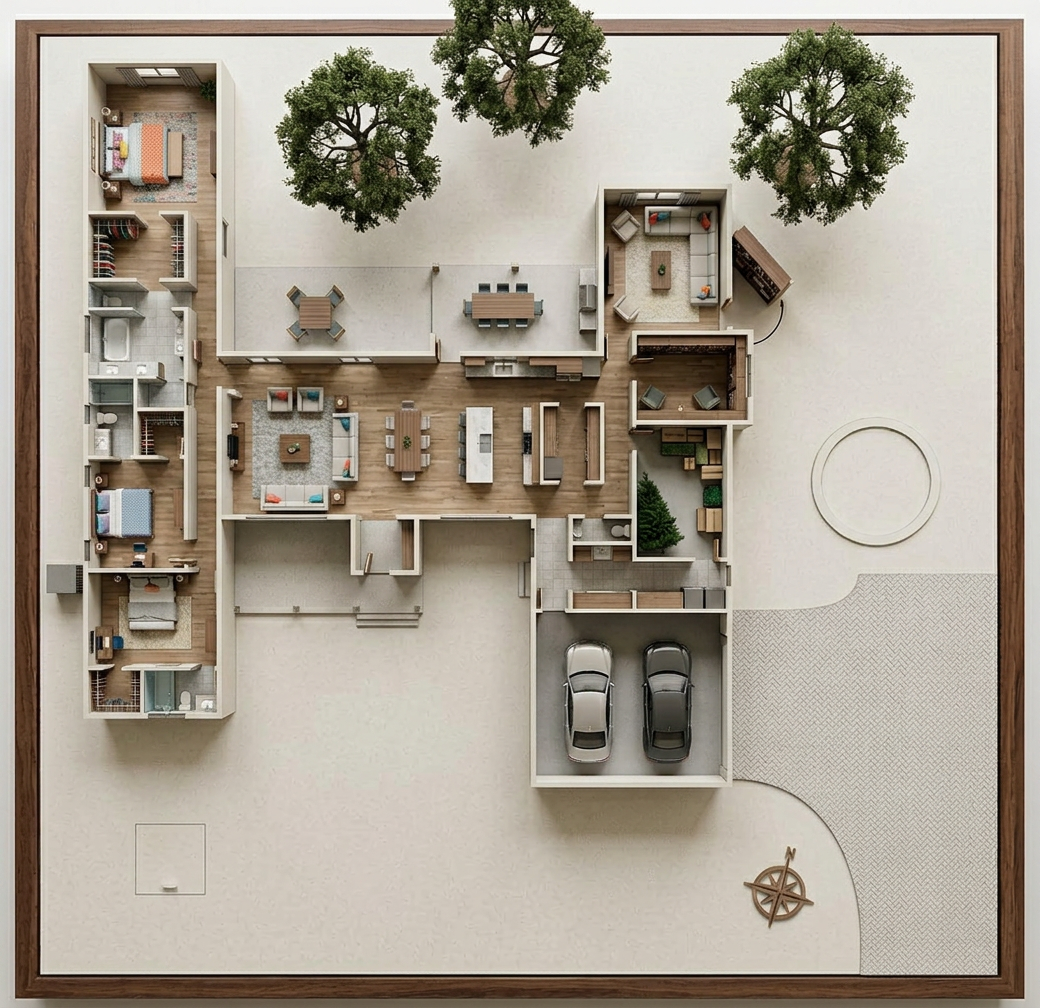 render realistic in a residential neighborhood with mature trees and lavish landscaping the limestone should be white with a black roof and black windows show a sidewalk and driveway leading up to the garage door