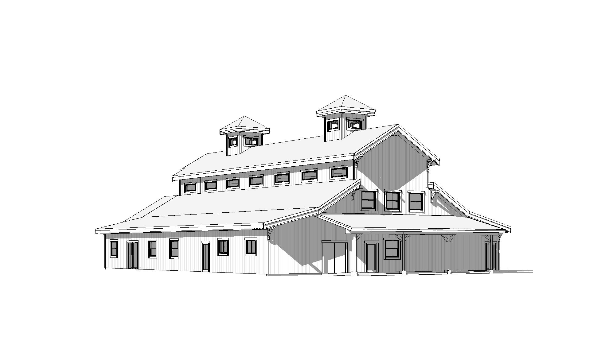 clean rustic event venue architectural exterior home rendered in cinematic daylight lighting with bits of blue skies and sunlight coming through the clouds event venue in a lush beautiful montana setting with green grass hills and a mountain range in the far distance in the background warm glow and reflections off of the windows select grade vertical wood siding green manicured landscape around structure with gardens and patches of grass black standing seam metal roof high fidelity photorealistic visualization crisp shadow falloff refined facade geometry soft atmospheric depth premium architectural photography mood ultra clean composition and materials photorealistic render black trim around the windows and doors prominent trees scattered around the property