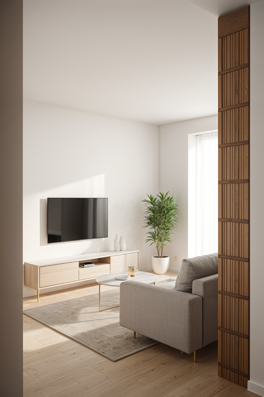 luxury modern apartment hallway light wooden floor smooth white walls modern ceiling lighting minimalistic scandinavian interior soft daylight from window elegant residential corridor realistic architectural render