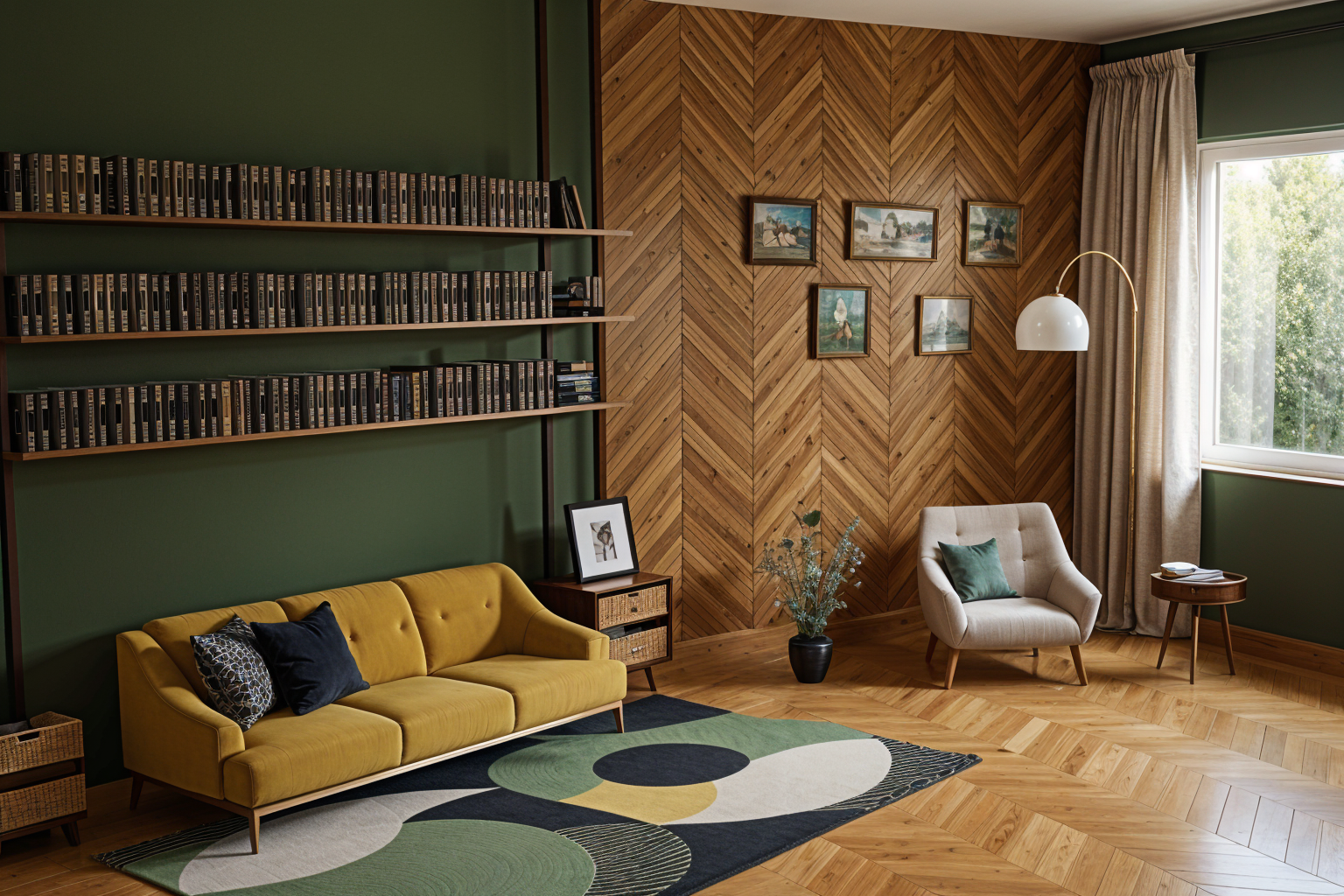 modernist interior shot ground floor apartment with kitchen dinning table and living room next to the window architecture