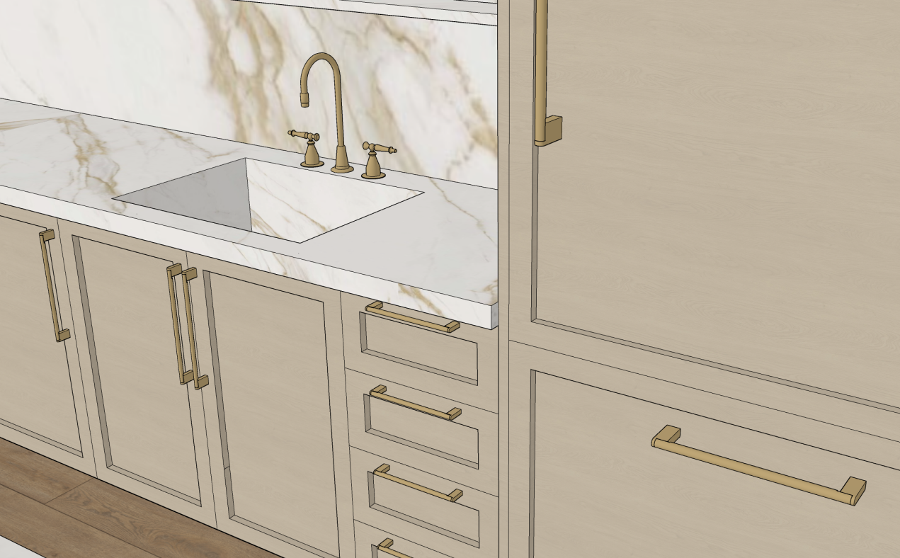 render this kitchen close up with fully photorealistic materials only do not change any colors materials finishes or proportions keep the light beige cabinetry exactly the same the white marble countertop and backsplash with gold and taupe veining exactly the same the warm brass hardware and faucet exactly the same and the medium warm wood flooring exactly the same maintain the existing layout camera angle and geometry only enhance realism by improving material depth texture reflections subtle shadows and natural surface variation do not alter the design or introduce new colors or finishes simply make the existing materials look real