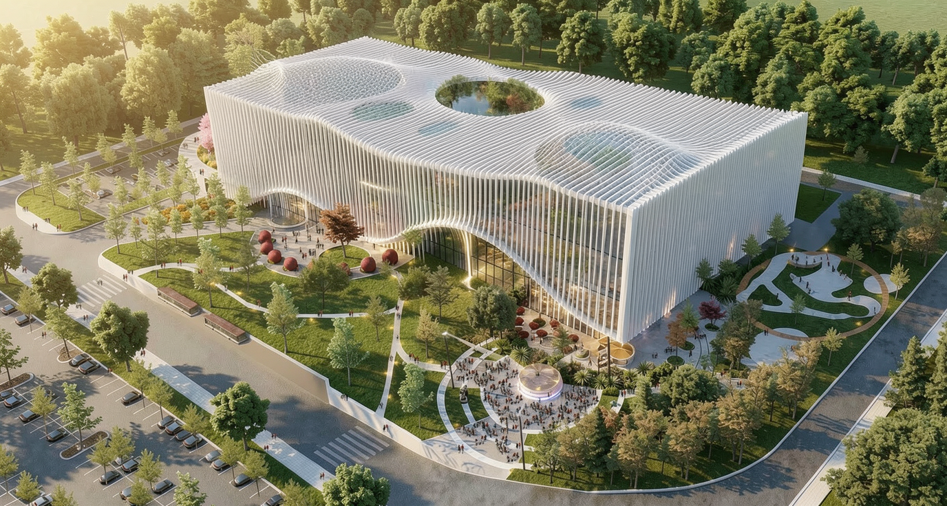 retain everything the style and lighting and render style just add the logo wave on the building