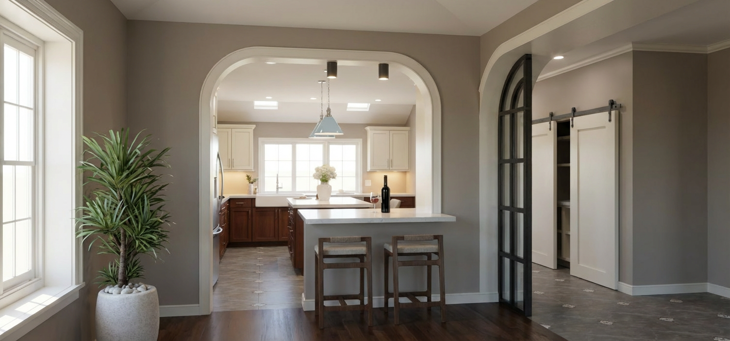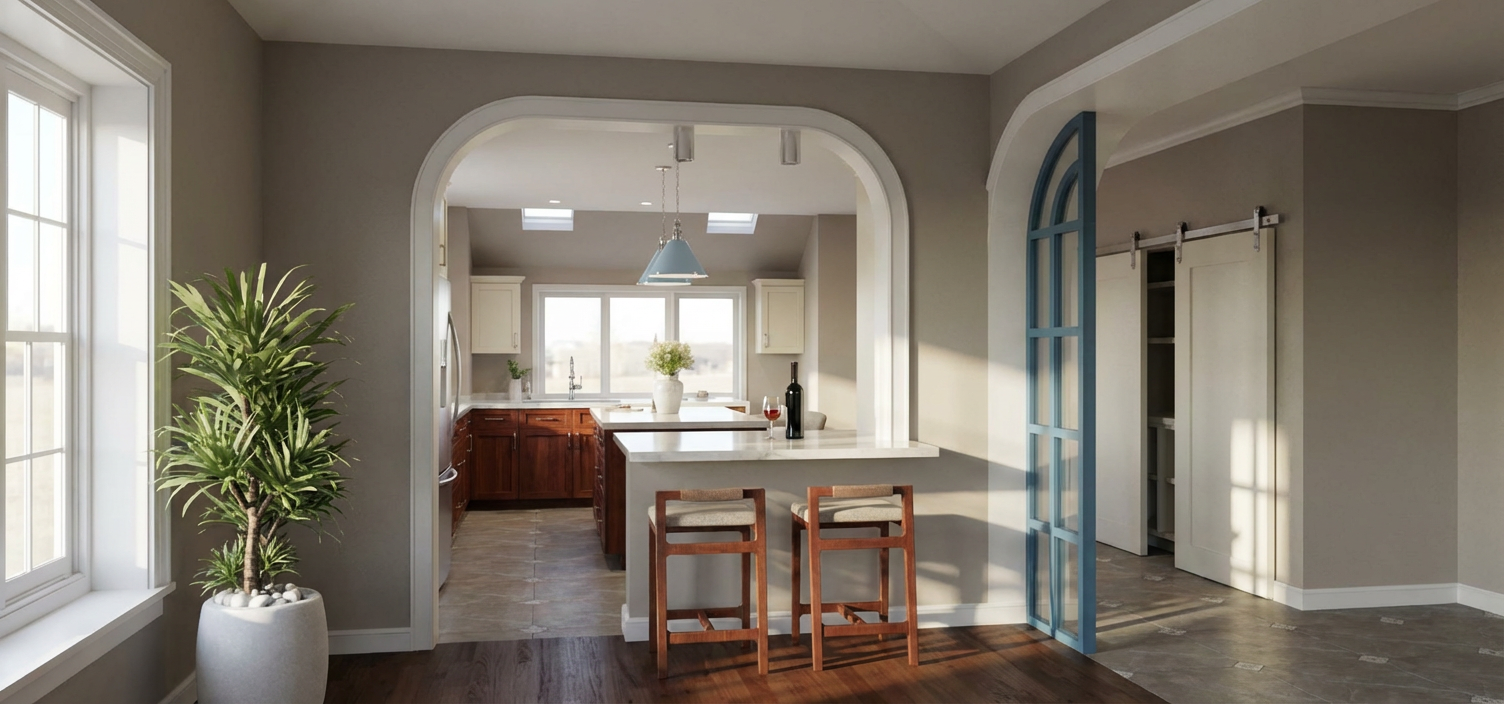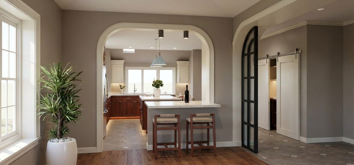 create a photorealistic rendering of the uploaded sketchup image this is a strict image to image rendering task reproduce the image exactly as shown do not reinterpret redesign or enhance the layout in any way strictly preserve the exact layout geometry and proportions of all elements cabinets island windows walls doors arches and openings do not add remove infer or complete any architectural elements cabinetry millwork or furnishings the kitchen layout shown is complete the back wall with the window must remain exactly as shown with only base cabinets do not add upper cabinets tall cabinets shelving or any additional elements to this wall or anywhere else in the image empty or open wall areas are intentional and must remain empty do not complete or fill any walls or surfaces if any area appears minimal or lacks detail preserve it exactly rather than improving it all materials colors and finishes shown in the image are final and must not be altered replaced or reinterpreted base cabinets must remain dark cherry wood do not change them to white or any other color do not apply default materials use soft natural daylight coming through the windows supplemented by subtle artificial lighting under cabinets and above materials should appear tactile and realistic cherry wood grain cream painted cabinets quartz countertops taupe eggshell walls baby blue pendants with chrome hardware polished nickel cabinet hardware and plumbing fixtures and realistic fabric textures include accurate reflections and shadows maintain a warm calm minimal and uncluttered atmosphere camera angle at human eye level composed like professional interior photography output must be a photorealistic version of the exact same image not a redesigned or reinterpreted space any deviation from the provided image is incorrect