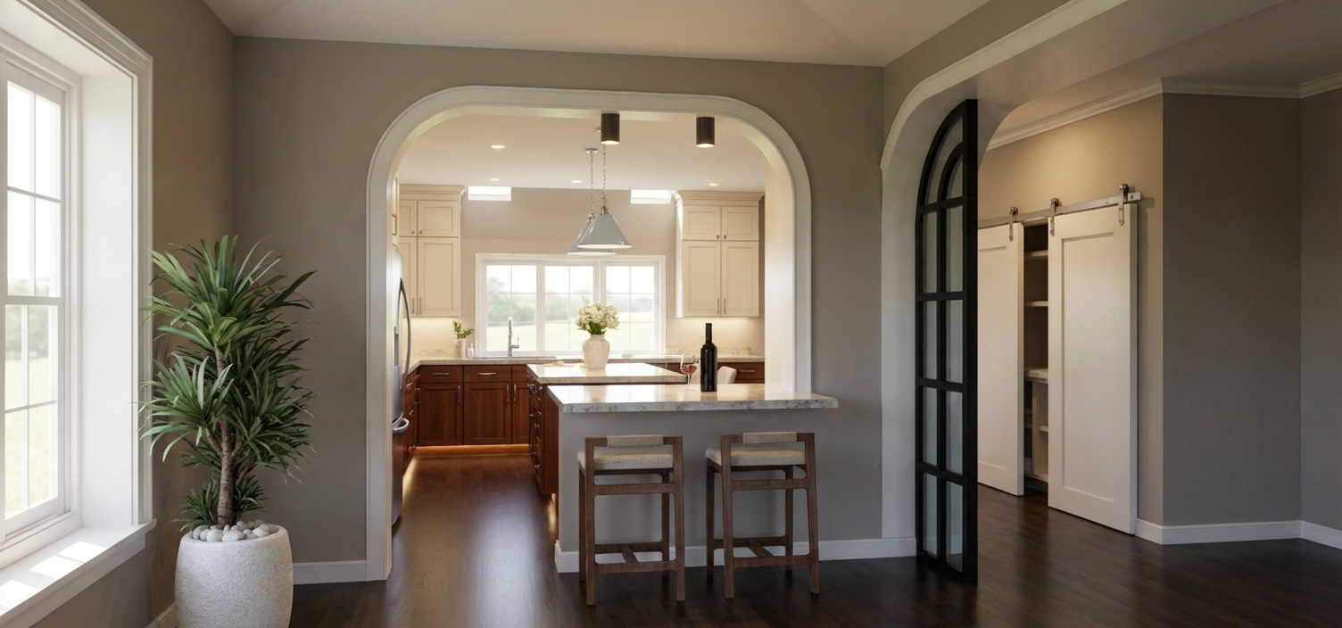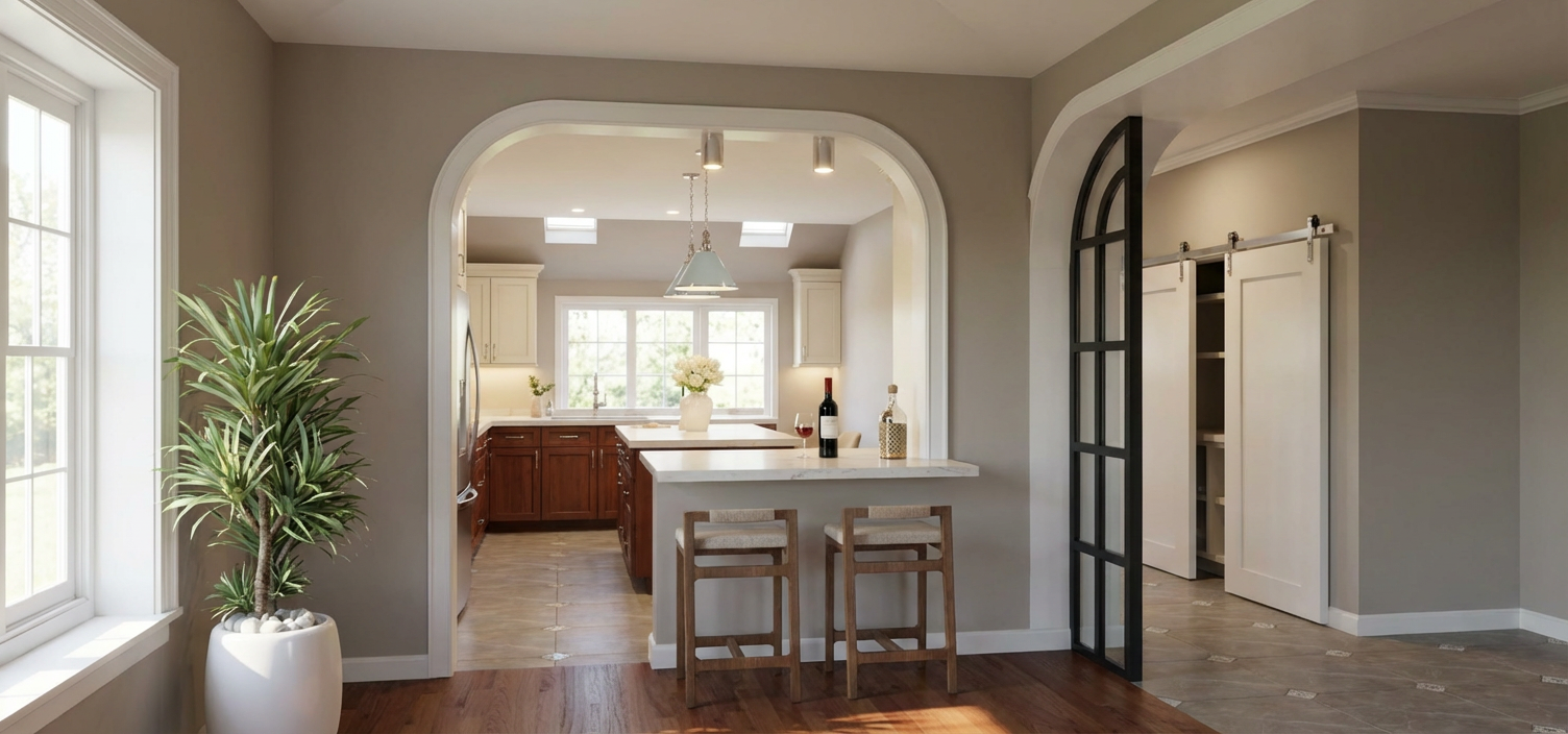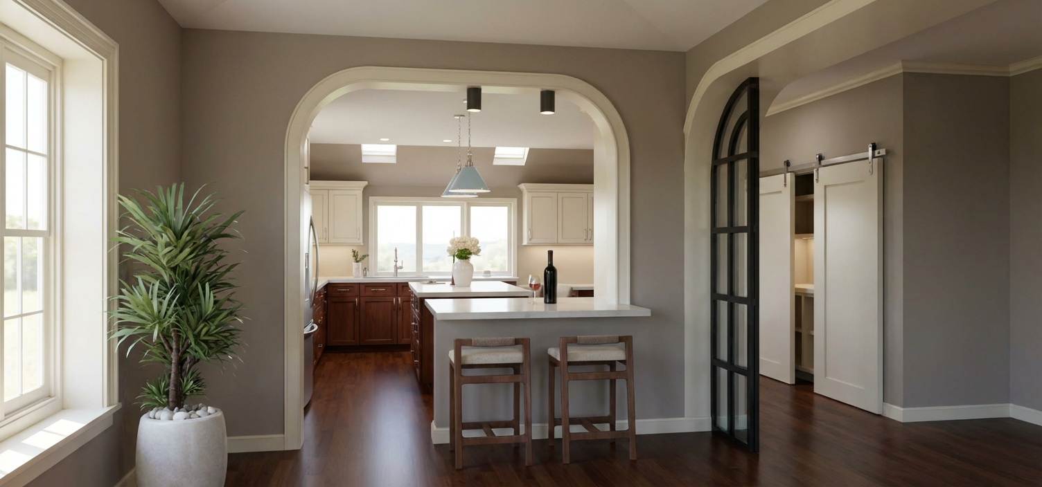 create a photorealistic rendering of the uploaded sketchup image this is a strict image to image rendering task reproduce the image exactly as shown do not reinterpret redesign or enhance the layout in any way strictly preserve the exact layout geometry and proportions of all elements cabinets island windows walls doors arches and openings do not add remove infer or complete any architectural elements cabinetry millwork or furnishings the kitchen layout shown is complete the back wall with the window must remain exactly as shown with only base cabinets do not add upper cabinets tall cabinets shelving or any additional elements to this wall or anywhere else in the image empty or open wall areas are intentional and must remain empty do not complete or fill any walls or surfaces if any area appears minimal or lacks detail preserve it exactly rather than improving it all materials colors and finishes shown in the image are final and must not be altered replaced or reinterpreted base cabinets must remain dark cherry wood do not change them to white or any other color do not apply default materials use soft natural daylight coming through the windows supplemented by subtle artificial lighting under cabinets and above materials should appear tactile and realistic cherry wood grain cream painted cabinets quartz countertops taupe eggshell walls baby blue pendants with chrome hardware polished nickel cabinet hardware and plumbing fixtures and realistic fabric textures include accurate reflections and shadows maintain a warm calm minimal and uncluttered atmosphere camera angle at human eye level composed like professional interior photography output must be a photorealistic version of the exact same image not a redesigned or reinterpreted space any deviation from the provided image is incorrect