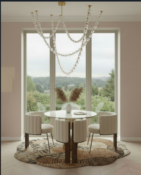 enhance the overall realism of the scene while keeping the same camera angle layout and furniture placement increase the level of detail in all materials maximize fabric realism on the dining chairs and upholstered elements by showing visible weave soft folds and natural light interaction improve surface textures on all materials including wood stone and metal so they appear highly detailed and tactile enhance the window reflections and natural daylight entering the space the windows should show subtle reflections on the glass and realistic exterior lighting replace the exterior view with a seattle coastal landscape including soft cloudy sky water and distant shoreline illuminate the cavalier chandelier by visual comfort above the dining table so it appears naturally lit the chandelier should emit warm light that softly reflects on nearby surfaces such as the table and fabrics with realistic highlights and shadows increase global illumination improve contrast and refine reflections on glass and polished surfaces to create a high end photorealistic interior rendering preserve all existing objects composition and perspective