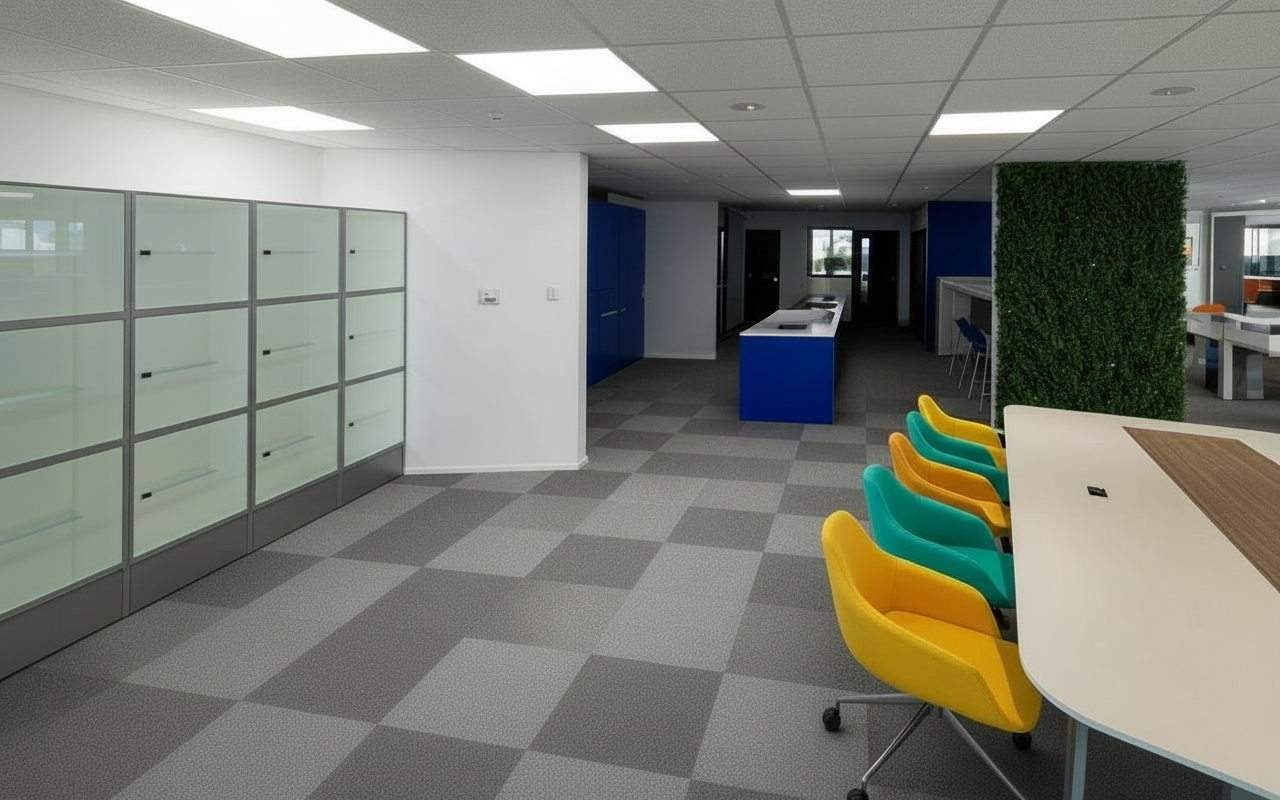 a modern office interior with glass partitions the atmosphere is professional and bright use warm beige for the wooden flooring deep green for the armchairs and a soft white for the walls the glass panels should reflect natural light and the ceiling is a subtle gray decorate with minimalistic black and gold wall art the desk is a rich walnut brown with sleek black accents add greenery on the windowsill for a touch of nature