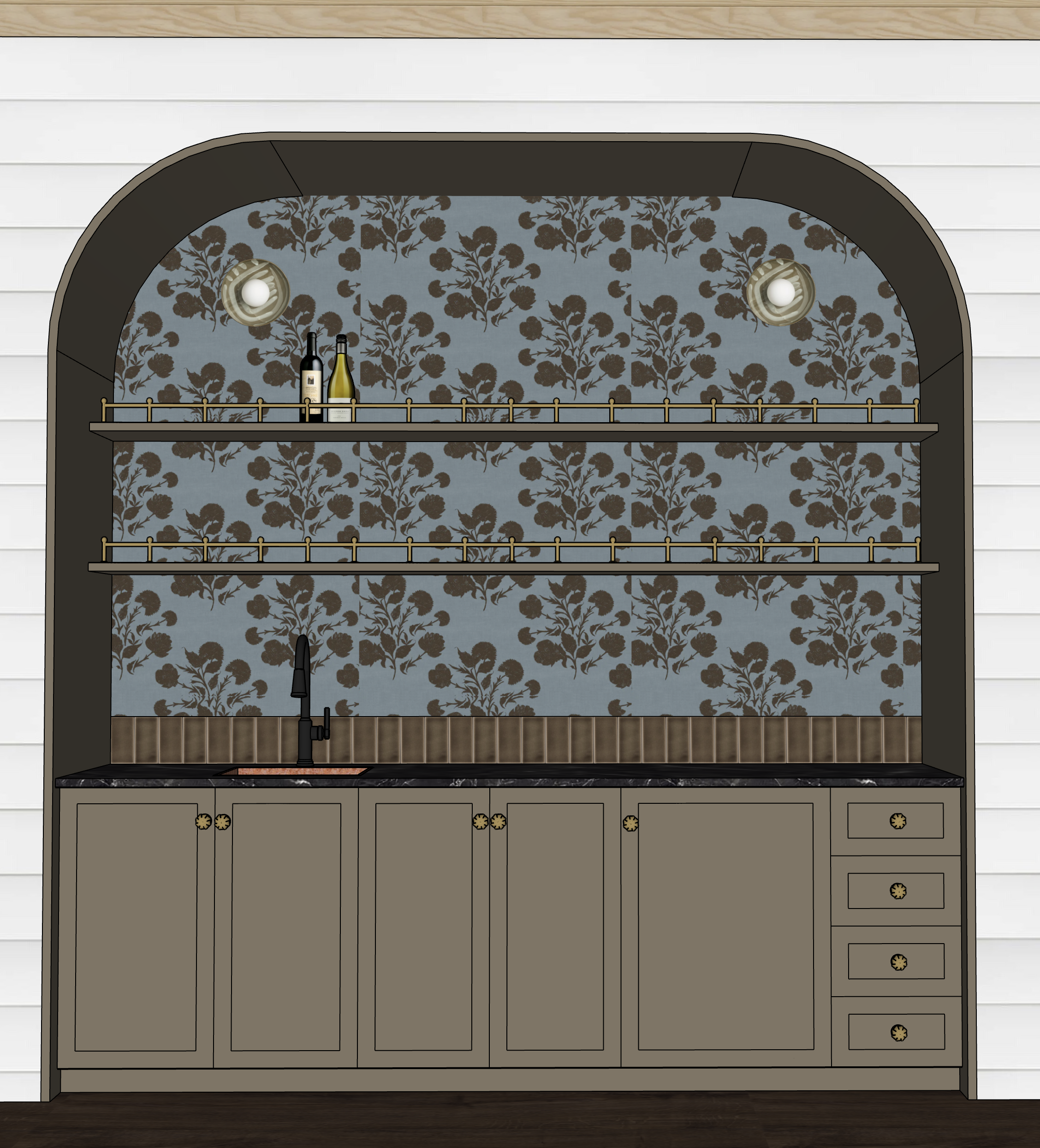 this beautiful mini bar within a dining room do not add anything on shelves make lighting bright and airy to see accurate dolors and textures