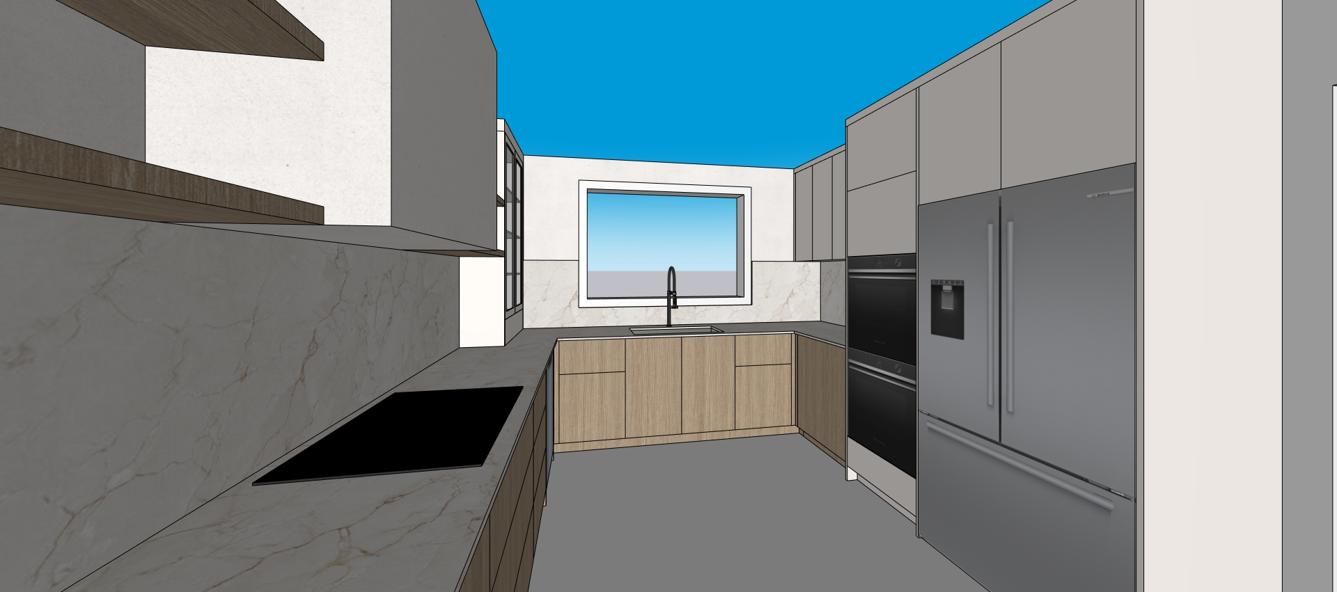 create a beautifully rendered japandi kitchen interior with a clean and minimalist design do not change the structure layout and design of this kitchen just add realistic materials lightings and decorations use soft beige plaster walls and insert hood to create a warm and inviting atmosphere design the kitchen cabinets with a light natural oak finish adding warmth and texture include a sleek marble countertop in off white with subtle veining highlight large windows with a off white modern roman shades adding natural light and an open feel the sink faucet and bar faucet are matte black enhancing the modern aesthetic add some decorations on floating shleves in minimal japandi style add modern sleek track lighting system in the kitchen add some plants and vase to provide fresh and natural feeling
