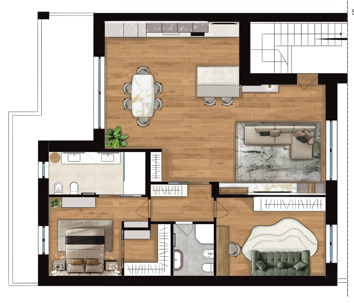sostituisci solo nella zona living il parquet con un pavimento beige sabbia