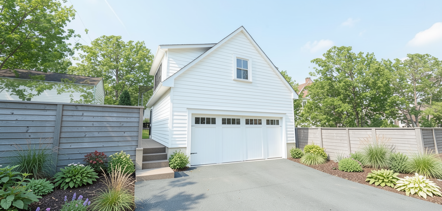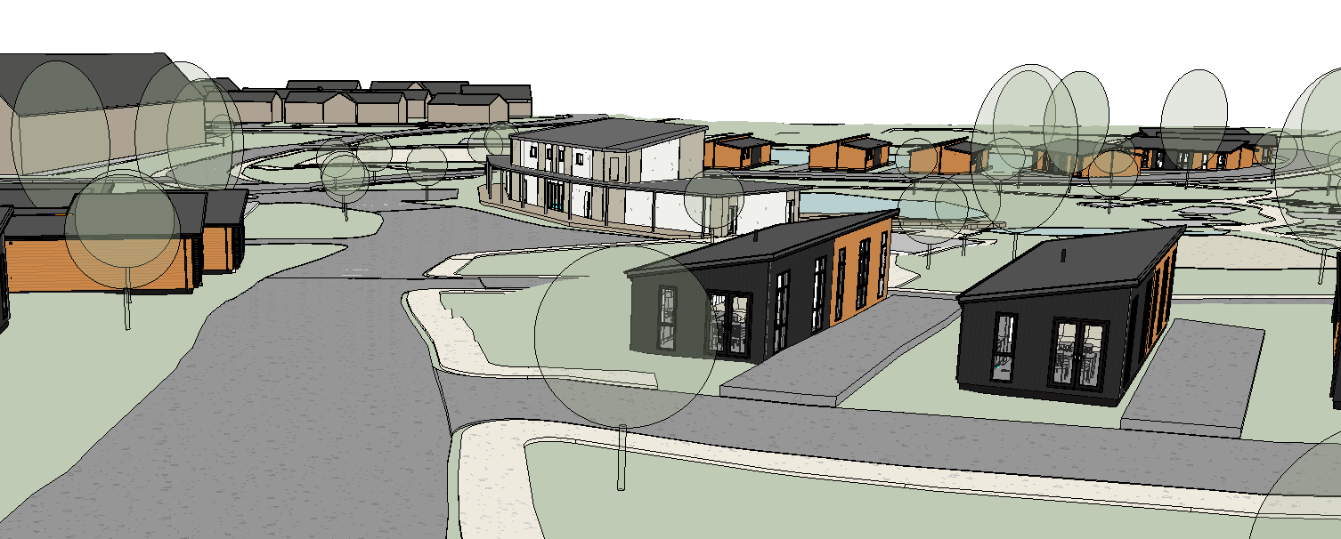 render a modern holiday park with black and timber clad lodges should be set in spring in the british countryside with native planting and light foliage there should be a red brick housing estate in the background and a red brick care home