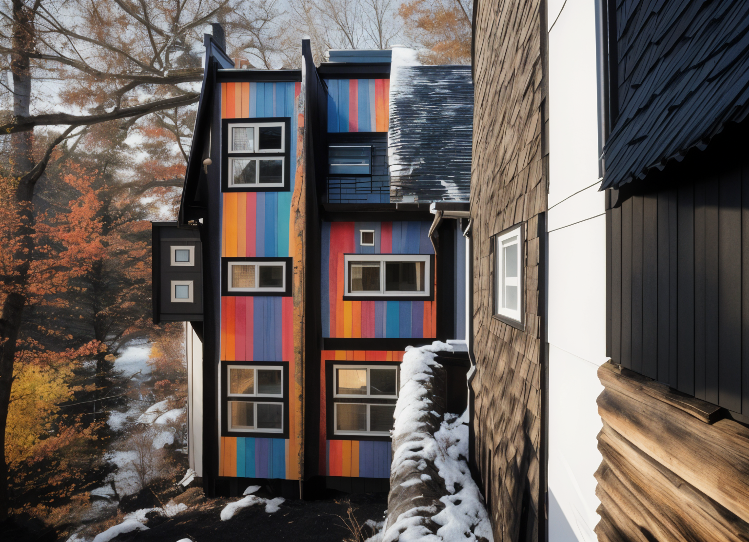 black standing seam roof red brick with black windows in the middle of a prairie with a gravel driveway leading up to the front door and a horse off in the distance