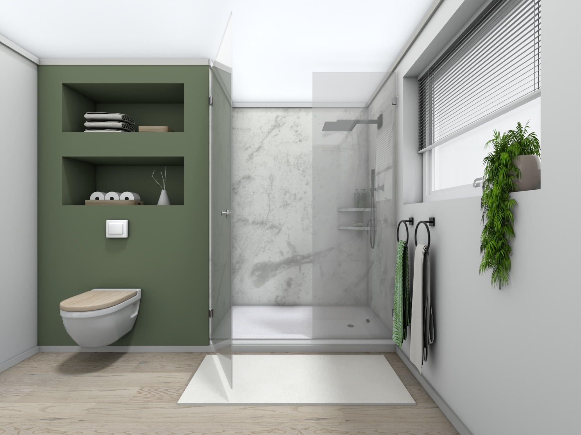 a sleek and modern bathroom with a clean minimalist design on the left side a small green painted wall section incorporates two recessed shelves neatly stocked with towels and a decorative plant below the shelves there is a modern wall mounted toilet with a light wooden seat the toilet area is complemented by a simple square light switch and a neutral colored floor mat the shower area located to the right is enclosed by a transparent glass partition the shower features a marble like wall and a stylish overhead rain shower head is visible above the shower there is a small window with silver blinds allowing natural light to enter the space beside the window a hanging potted plant adds a touch of greenery on the wall near the shower two towel hooks are installed holding towels in black white and green tones the warm wood flooring complements the subtle color palette and clean lines enhancing the calming and contemporary feel of the bathroom the overall design focuses on functionality and simplicity with natural materials and sleek finishes architecture