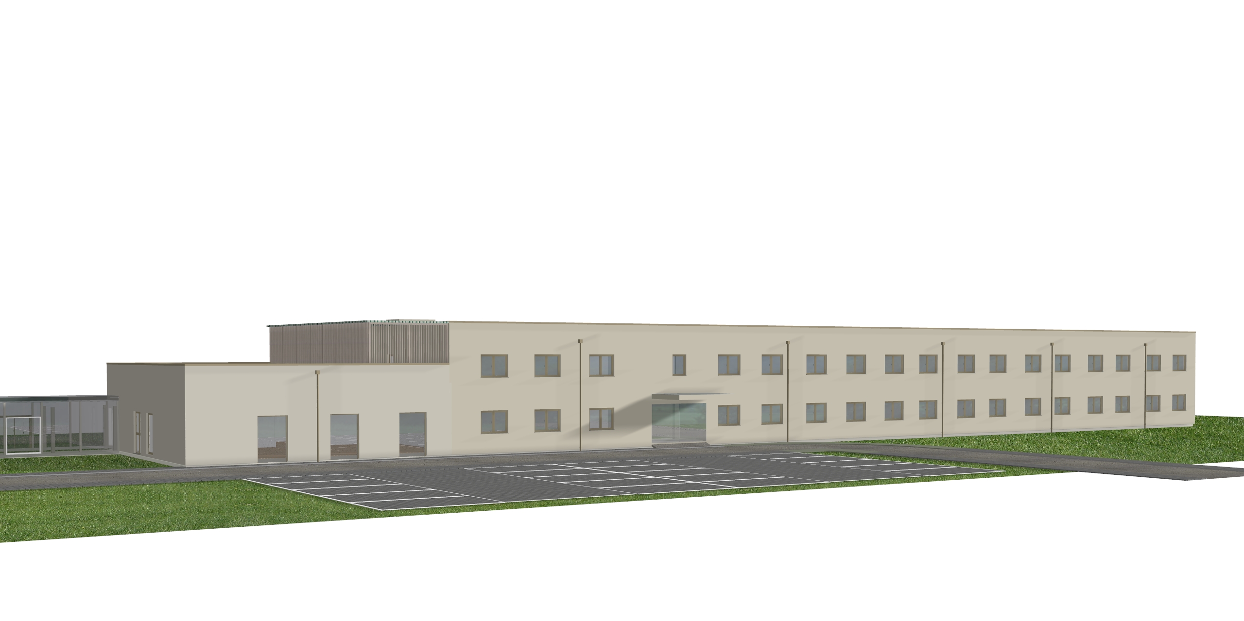 du bist architekt und proffesioneller visualisierer erstelle zu diesem geb uder welches ein hotel ist einen realistischen hintergrund bzw umgebung lasse die gesamte geb udeform unbedingt wie es im bild dargestellt ist der linke abgesetzte bereich ist mit der fassadenfarbe ral 7044 der zweist ckige rechete bereich ist mit fassadenfarbe ral 7032 gezeichnet die fensterfarben sind ral 7034 zu zeichnen auf dem parkplatz k nnen auch 5 autos parken