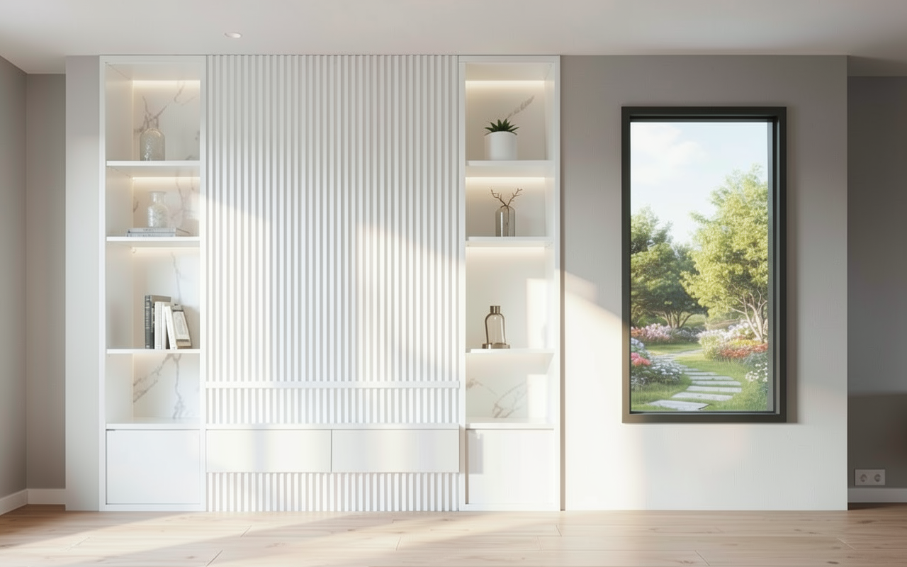 behind the shelves make them wooden color like the the base and the big fluted wooden wall between the shelves make it plain white not fluted just white paint