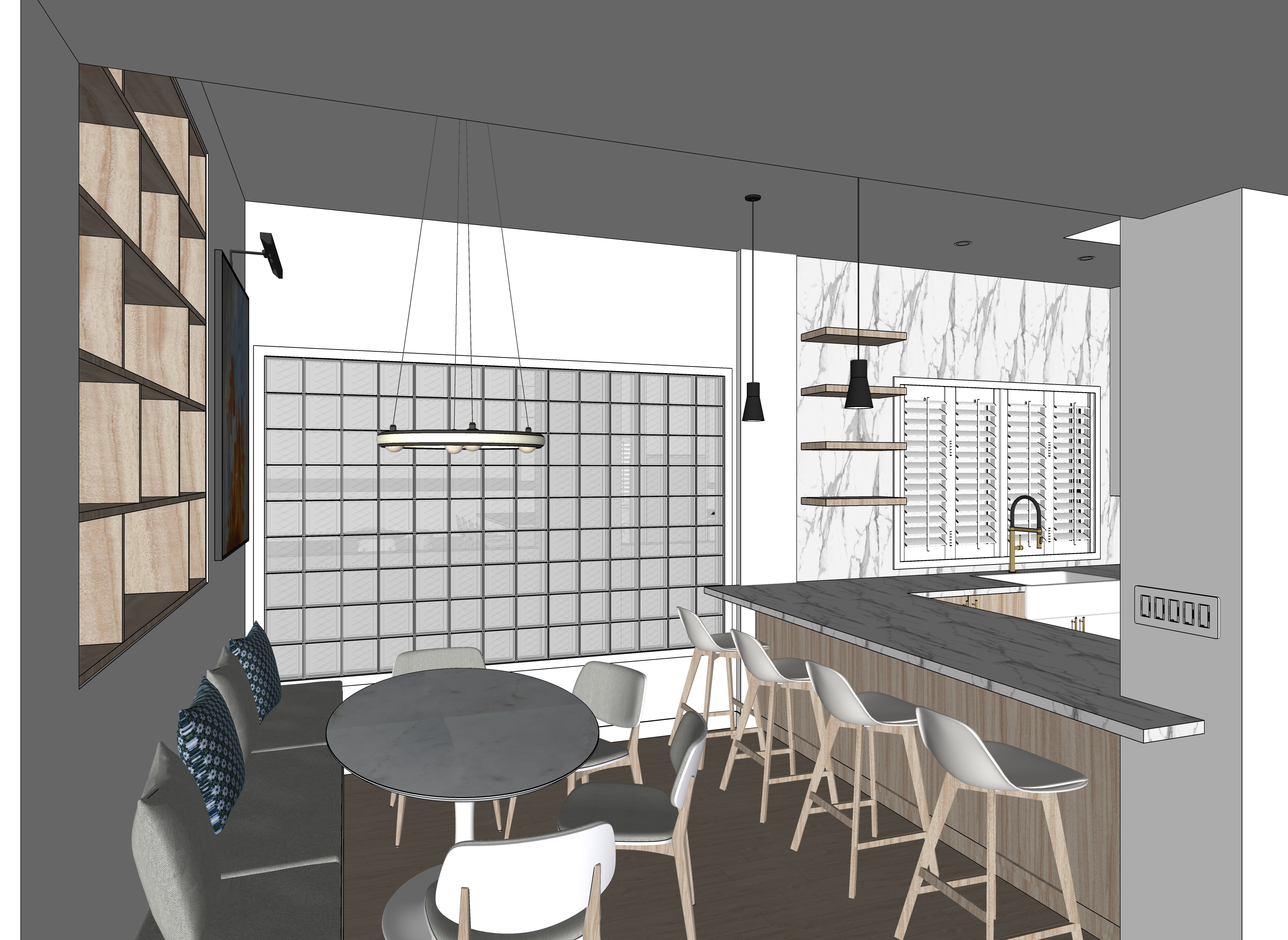 evening light outside the windows add light from the chandelier over the dining table add light from the recessed lights add some accessories and books on the shelves at the left side of the view add a woman standing at the sink in the kitchen add a man sitting on a middle stool at the counter add some appetizers wine glasses and a bottle of red wine on the counter make the light level in the kitchen a little lower and warmer in color add a floral arrangement on the dining table show the white calcutta same material on the wall of the kitchen as the counter add light from the chandelier over the dining table add light from the recessed lights add some accessories and books on the shelves at the left side of the view add a woman standing at the sink in the kitchen add a man sitting on a middle stool at the counter add some appetizers wine glasses and a bottle of red wine on the counter make the light level in the kitchen a little lower and warmer in color add some tea candles on the dining room table show the white calcutta same material on the wall of the kitchen as the countertops the louvered shutters in the kitchen window are painted white the louvered shutters in the kitchen window are painted white the walls and ceilings are painted white the upper cabinets in the kitchen have slab doors in white no pulls remove the floral arrangement on the dining room table add 3 sofa pillows on the bench at the dining room table make the glass blocks more translucent make the glass block more translucent do not add any cabinets to the scene