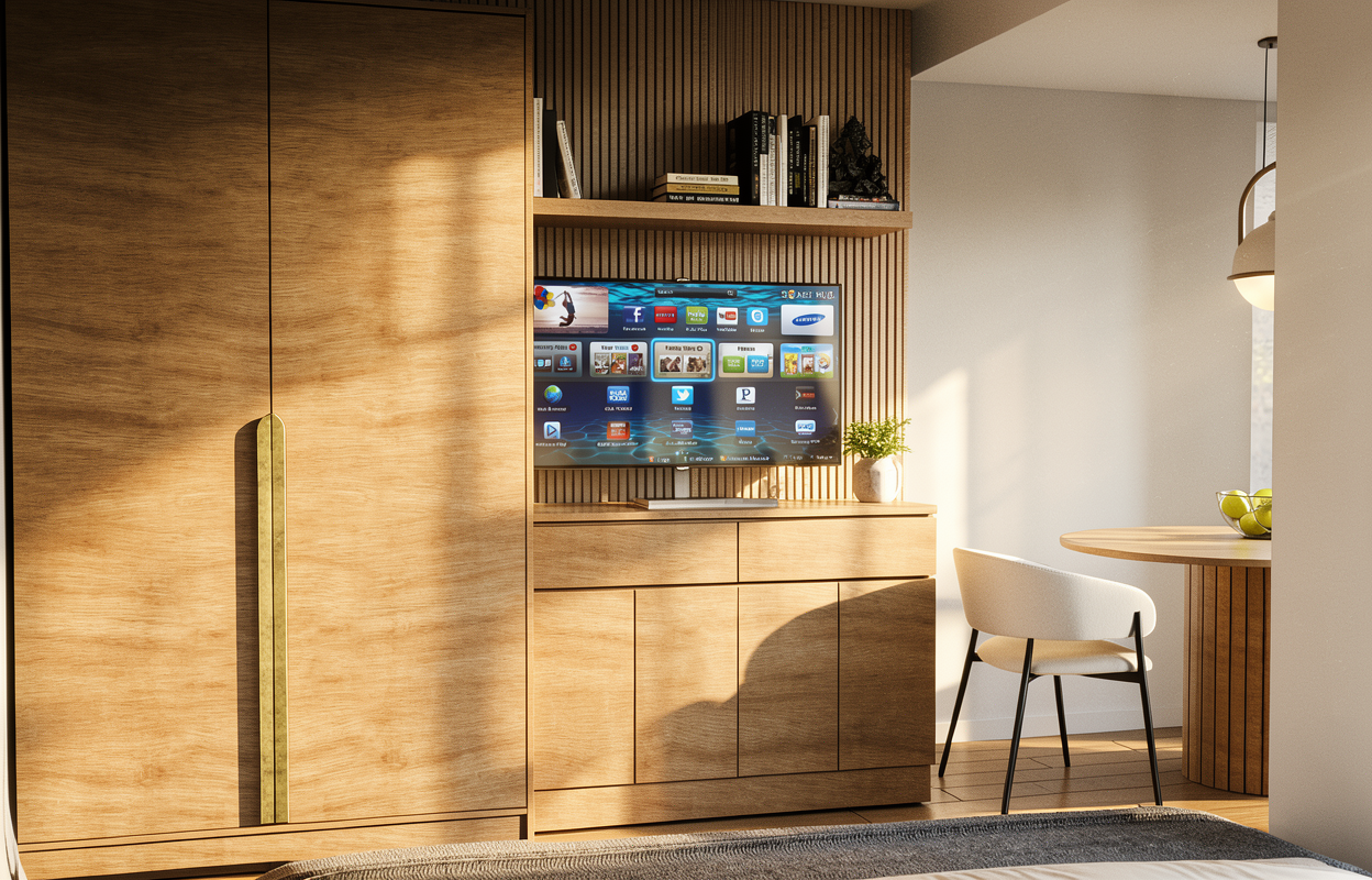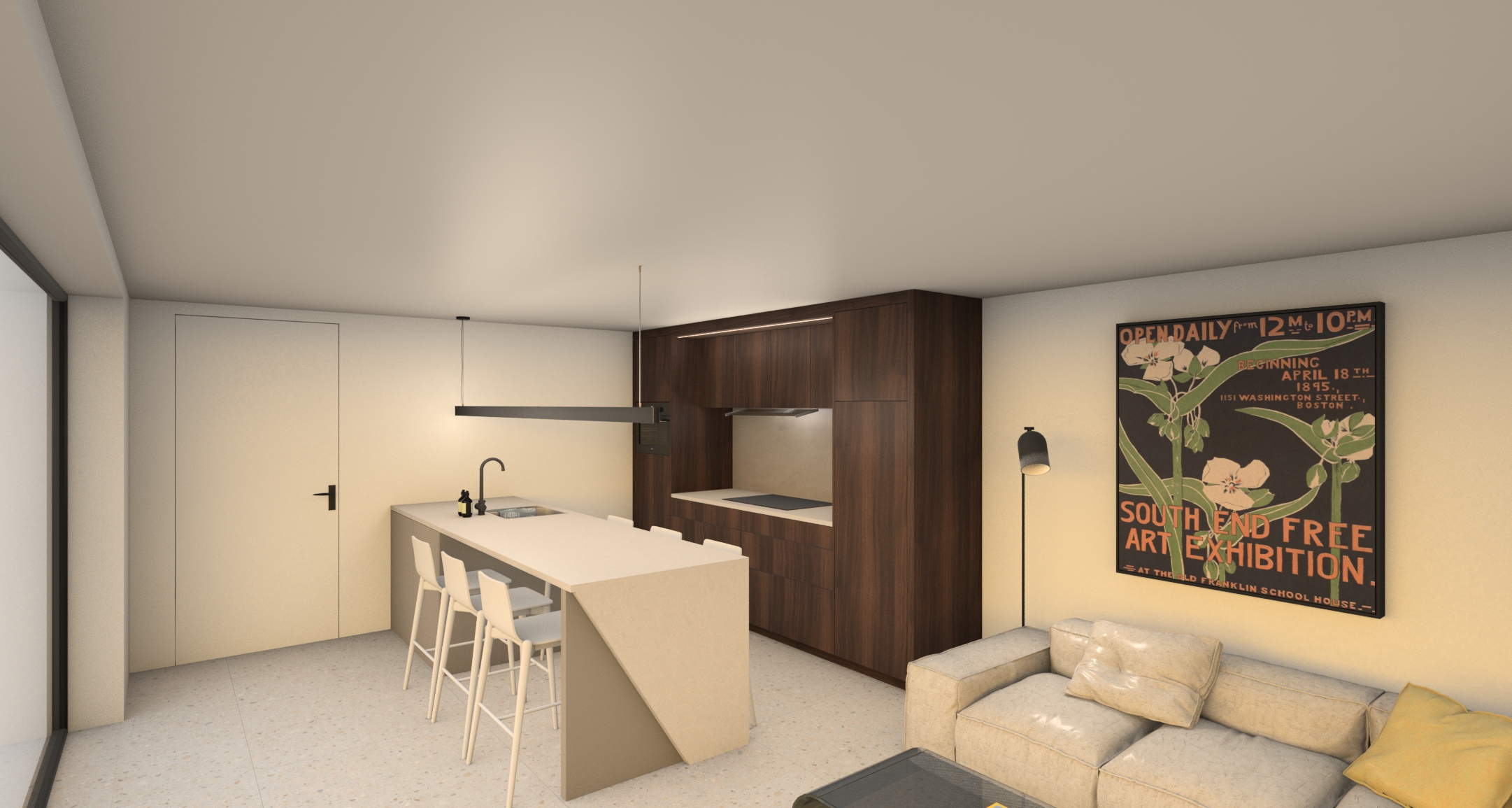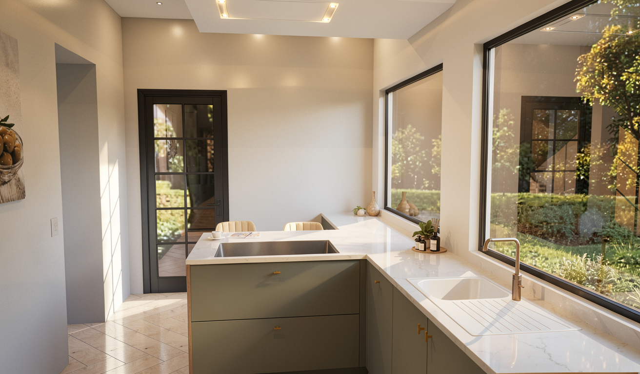 convert this architectural interior rendering into a realistic photo taken with a full frame camera and a 24mm tilt shift lens keep the same camera angle and layout add natural daylight realistic shadows accurate reflections subtle material imperfections real world texture detail slight lens softness realistic exposure and true photographic depth the final image should look like a professional real estate or architectural photograph not a 3d render