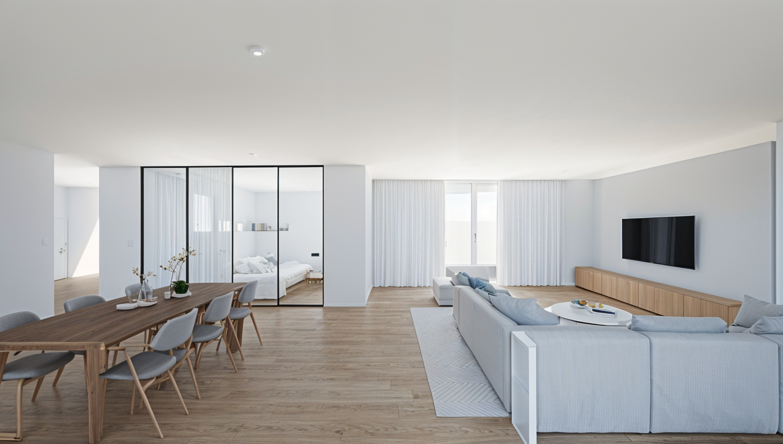 make a realistic 3d image of this modern flat light wood flooring and and white furniture make the right hand side corner wall in natural stone