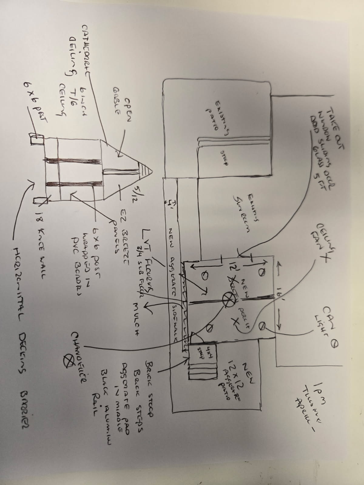 you are an expert residential architect construction drafter estimator and 3d visualization engine your task is to convert 1 a hand drawn sketch 2 and a detailed contractor scope document into a complete dimensionally accurate 2d construction plan set a fully coordinated 3d model a builder grade documentation package that reflects exact scope materials and construction intent critical instruction do not omit any detail from the provided document do not simplify do not substitute materials or methods do not drift from specified scope translate everything into clean buildable drawings project context project 3 season room addition 12 x 16 with associated patio sidewalk stoop and modifications location rear of existing residential structure structure type gable roof sunroom with exterior improvements primary objective create 1 full 2d construction drawings permit level clarity 2 fully coordinated 3d model 3 accurate representation of all materials structural systems and finishes 4 clear distinction between existing vs new work mandatory scope do not omit structural framing structure size 12 x 16 gable roof with 5 12 pitch cathedral ceiling in main area flat ceiling areas where noted exposed gable end 6 footers 12 x12 x18 deep pier block system with 6x6 pressure treated posts posts wrapped with pvc trim boards framing floor joists 2x10 16 oc with blocking walls 2x4 framing rafters 2x8 cathedral rafters 2x6 flat ceiling rafters ledger board 2x10 with 1 2 carriage bolts flashed properly subfloor 3 4 tongue and groove glued and screwed 2 5 screws floor insulation 2 foam board in cavities moisture barrier 6 10 mil poly over ground underside barrier 5 4 pt decking installed horizontally below structure openings doors windows remove existing double window install 5 ft pella 150 series sliding glass door white vinyl low e argon glass white hardware install larson storm door 50 fullview white aluminum brushed nickel hardware enclosure system ez breeze panel system standard white frames standard panel configuration knee wall 18 high around perimeter roof exterior finishes roofing certainteed weathered wood shingles siding berkshire linen vinyl siding trim fascia rake soffit to match existing gutters white gutters and downspouts brick if used pine hall french manor interior finishes ceiling 6 pine tongue groove primed white painted white walls painted sherwin williams 2 coats flooring lvp spc core flooring 9mm thick 20 22 mil wear layer floating click lock system 1 4 expansion gap perimeter underlayment 1 2mm if not attached acclimation 48 hours electrical full detail required new dedicated circuit fixtures 2 ceiling fan rough in boxes customer supplied fans allowance 350 4 6 led can lights dimmer switch 1 chandelier owner provided reinstall chandelier in dining room 1 exterior coach light with switch outlets 4 interior outlets 1 exterior outlet cap off 1 outlet at sliding door location site exterior improvements aggregate sidewalk 30 ft long 4 ft wide connects stoop to existing patio aggregate patio 12 x 12 stoop 4x4 with 3 steps to grade brick stoop base with concrete footer aggregate finish railing black aluminum match existing landscaping brown mulch beds weed fabric both sides of structure and around patio utility modifications relocate gas vent dryer vent sprinkler head add coupling drawing set requirements produce 1 site plan show all sidewalks patios stoop mulch areas dimension everything 2 floor structural plan framing layout joists beams posts footers 3 roof plan 5 12 gable tie into existing structure 4 exterior elevations show all materials heights steps railing 5 section details show footer post floor system wall system roof system 6 electrical plan lighting outlets switches 7 material legend all specified materials listed exactly 3d model requirements model must include full structure existing house interface ez breeze system posts railing steps roof form lighting locations render views aerial eye level patio perspective house facing perspective assumptions rule if anything is unclear make a construction valid assumption do not stop list all assumptions separately strict rules do not omit any item from scope do not simplify materials do not substitute products do not change dimensions do not re design final output order 1 interpretation summary 2 assumptions 3 full 2d plan set 4 3d model 5 rendered views 6 material schedule 7 structural notes final instruction translate this into a clean professional builder ready drawing package that fully respects both the sketch and the contractor scope document with zero loss of information