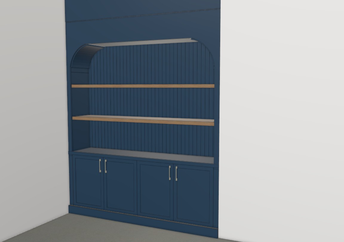 add lounge decor to shelves add a horizontal light to top panel above arch add a fireplace and mantel to the right side wall and someone standing near the fireplace