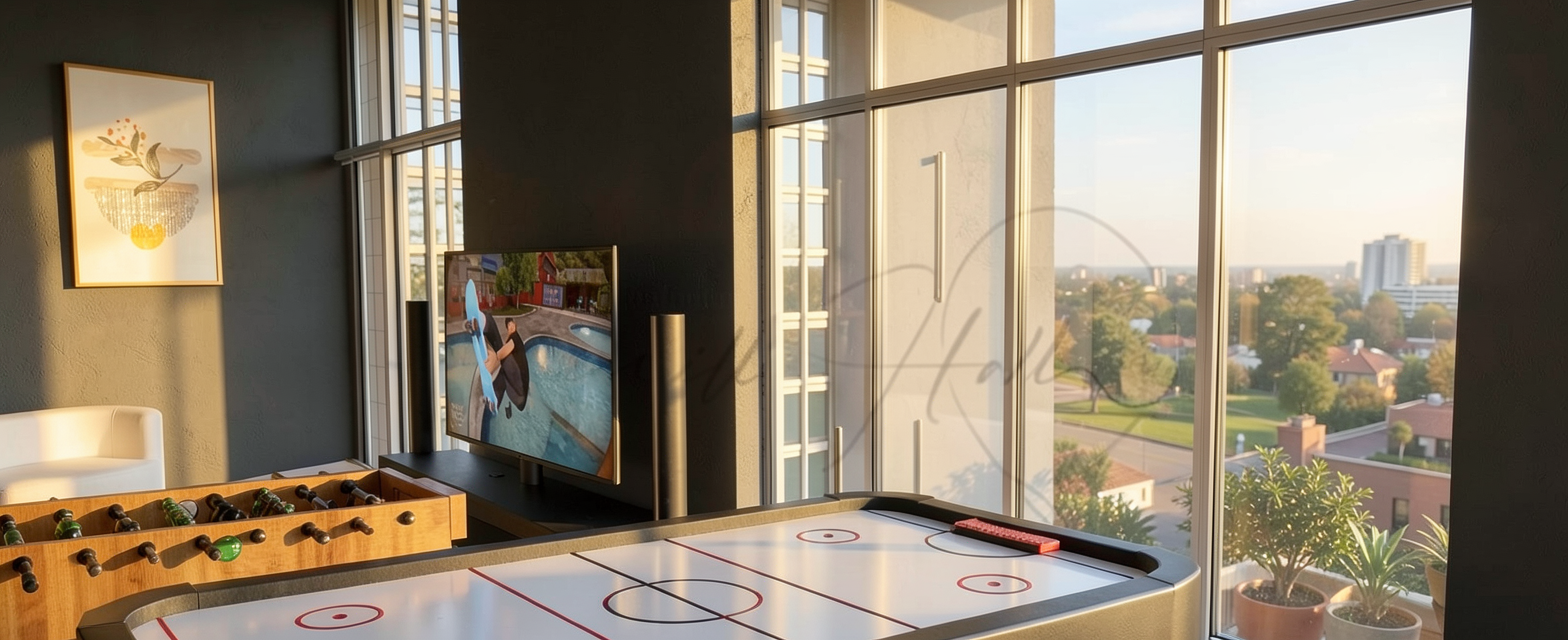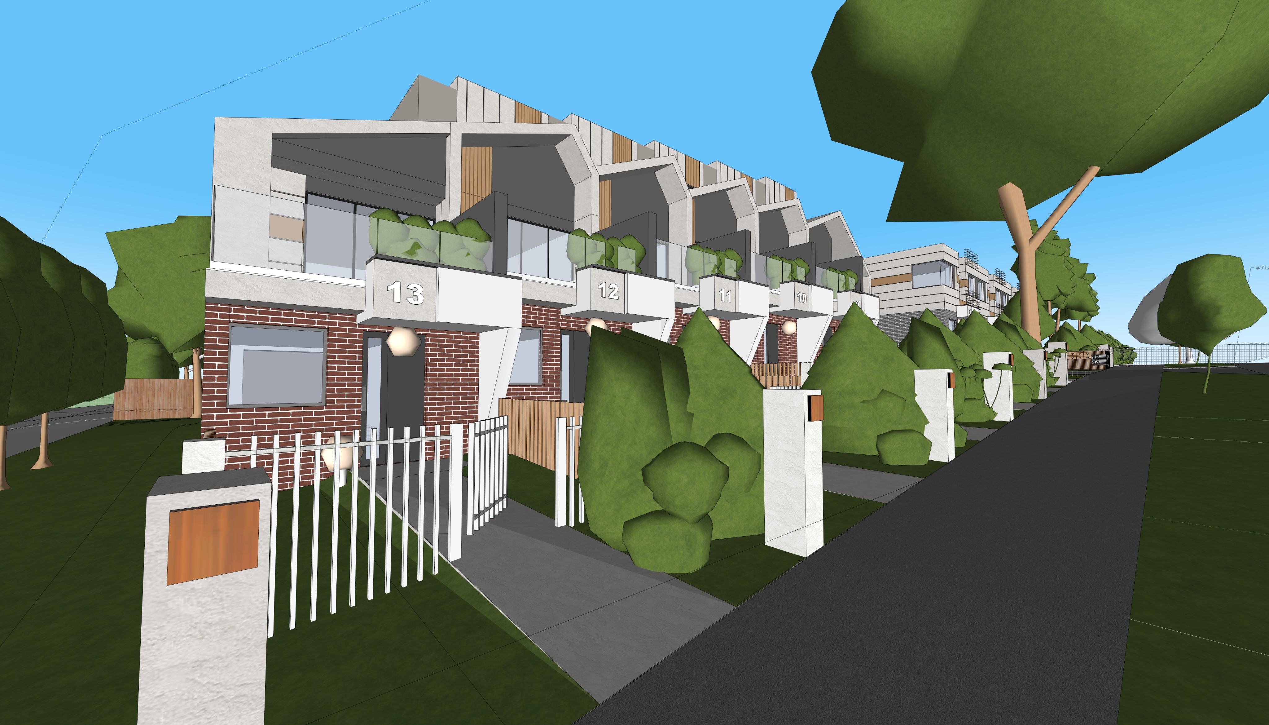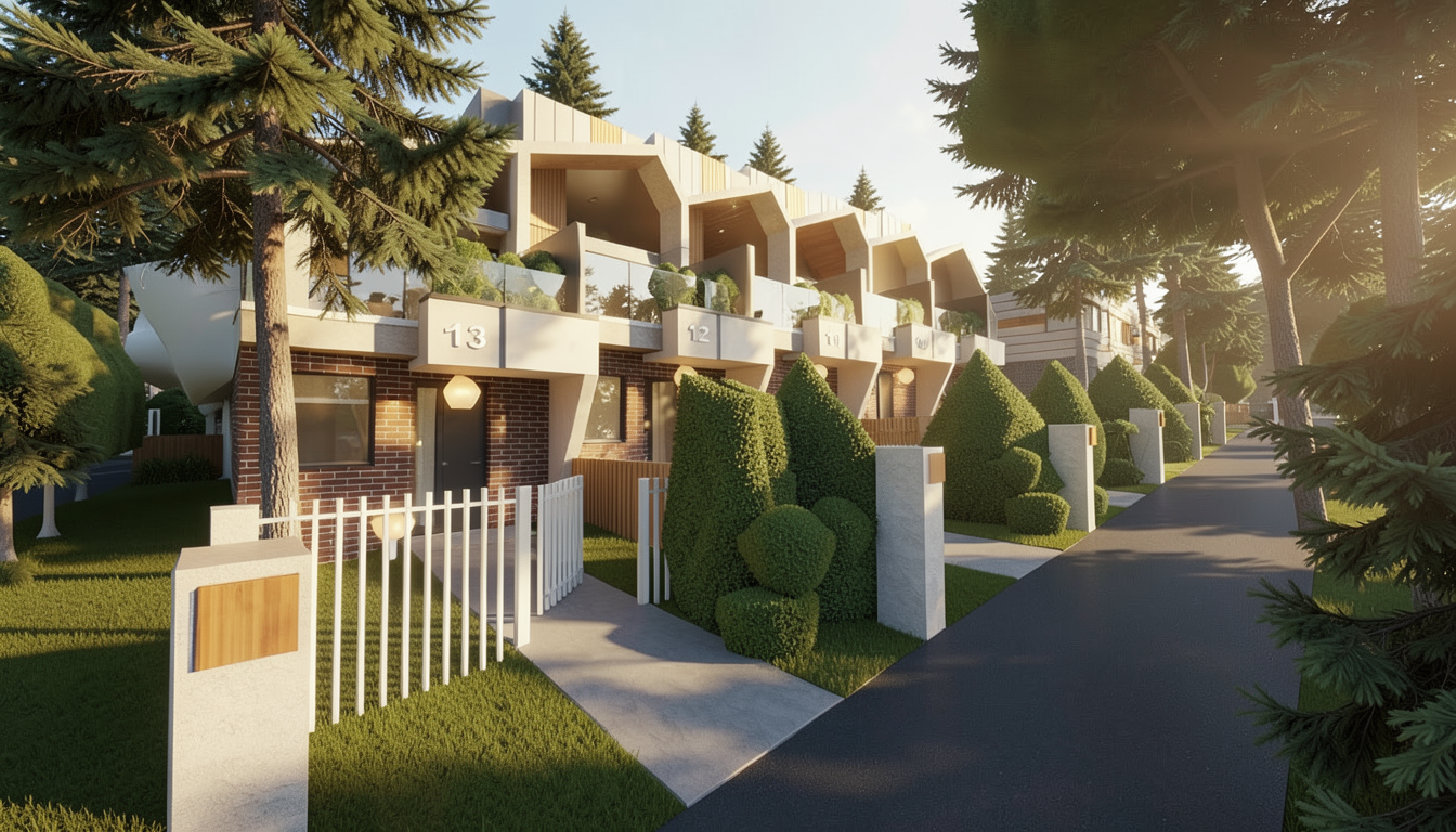 commercial architectural visualization cinematic lighting effect 3d perspective surrounded with evergreen tree and brushes