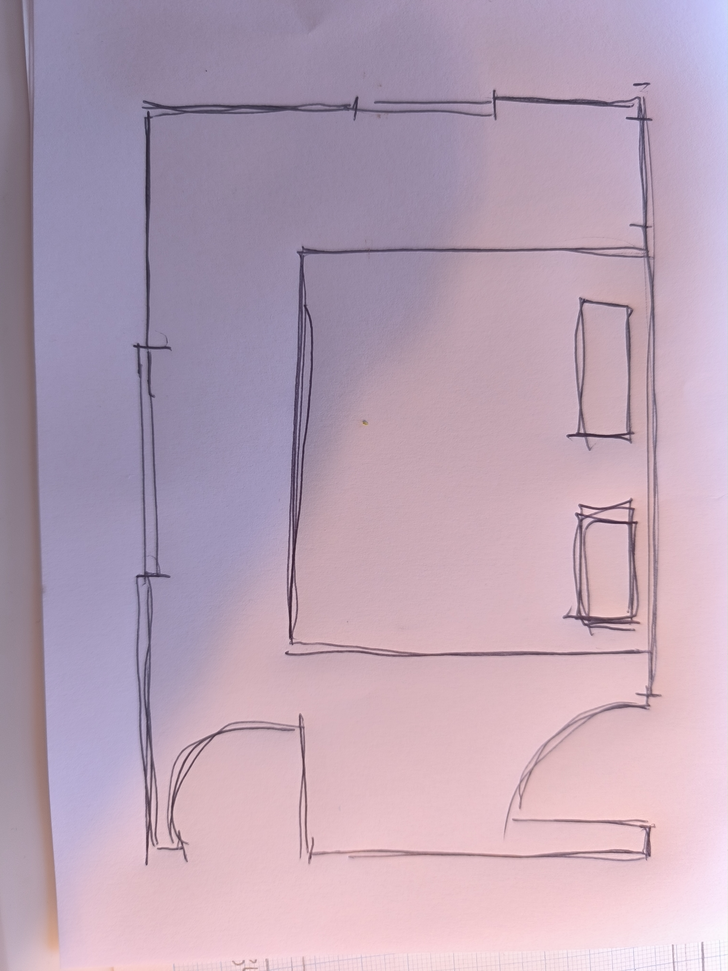 this is a sketch of a bedroom it is 14 5 square metres please do a 3d render of the room make the wall behind the bed dulux blush noisette 2 colour drench the rest of the room in a soft neutral to match give the bed a headboard covered in a pale blue and pink floral pattern add curtains to one windoe and roman blind to the other window in a fabric to compliment but not to match fabric on headboard add a pendant to the centre of the ceiling and add two pendants either side of the bed dress the bed with cushions to complimet the scheme and acessories to make the bed look dressed and plush