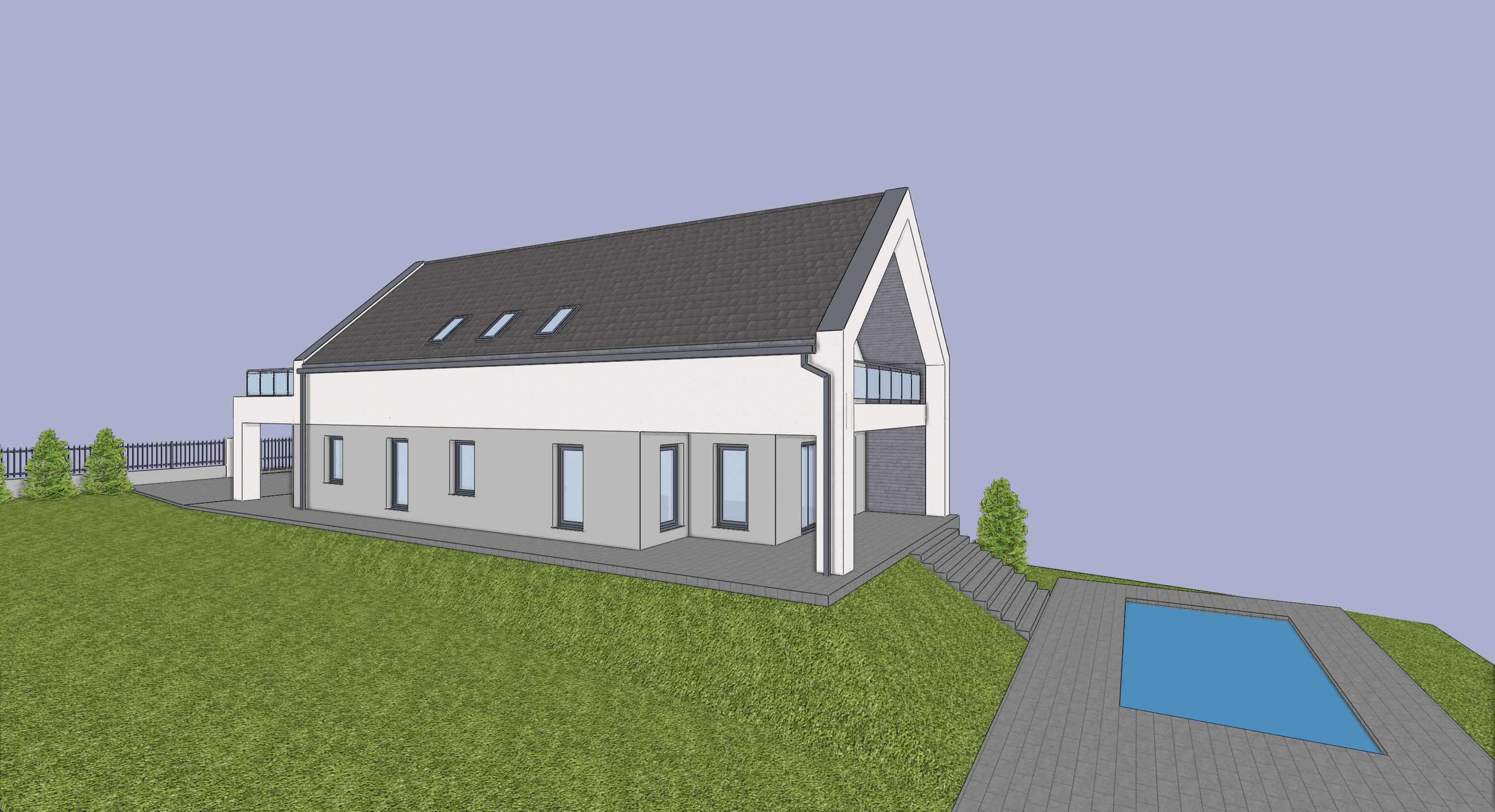 render a modern minimalist house with a white wall with grey accent and gray roof featuring large glass windows surround it with a lush green lawn and a row of evenly spaced tall evergreen trees add a small inviting blue pool adjacent to a charcoal gray patio capture an atmosphere of tranquility and elegance under a soft clear orange sky use realistic lighting to emphasize the clean lines and open space trees and small houses on the background