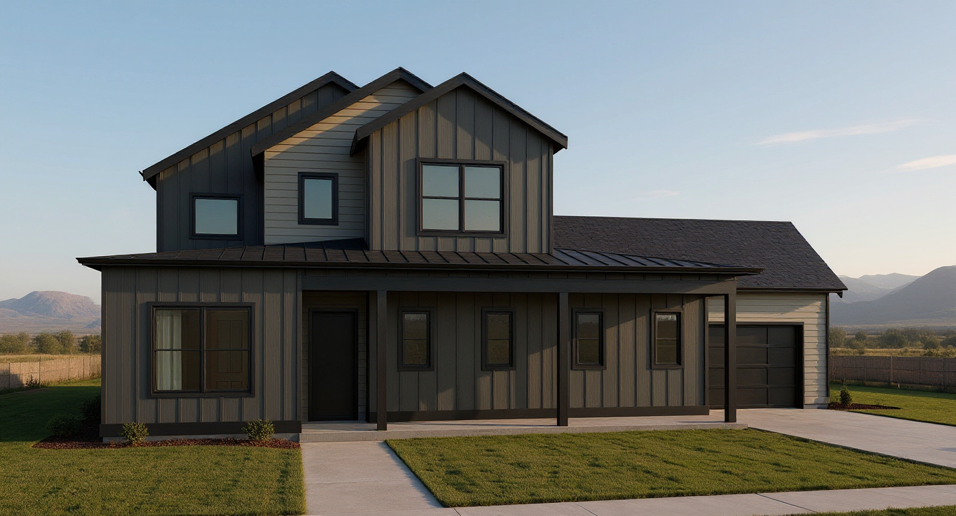 white stone walls dark slate roof charcoal gray steel windows and trim arched opening at entry vestibule and front door arched front door and sidelights add more gable roofs add lush landscaping bushes and flowers in front of house add oak trees behind house