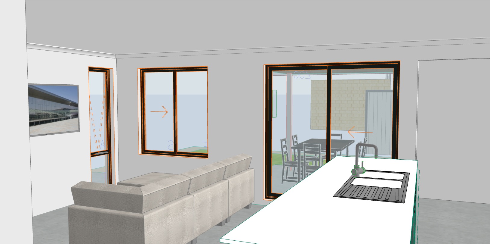cozy modern kitchen and dining room with a warm and inviting atmosphere use soft cream walls and tiled flooring in a light shade the kitchen cabinets are a sleek matte white with brushed stainless steel handles add a dark grey stone countertop the l shaped sofa is upholstered in a soft light grey fabric with cozy white and navy blue throw pillows the dining table is a rich walnut wood with matching chairs large windows let in natural light with sheer white curtains gently flowing accentuate with indoor plants and ambient warm lighting