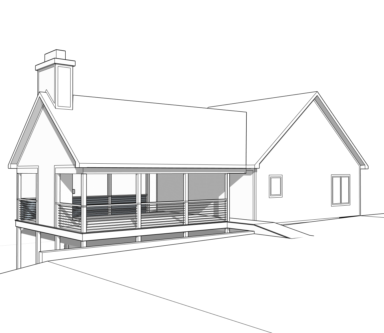 lake house with large screened porch make realistic gravel driveway grey board and batt siding black trim and windows