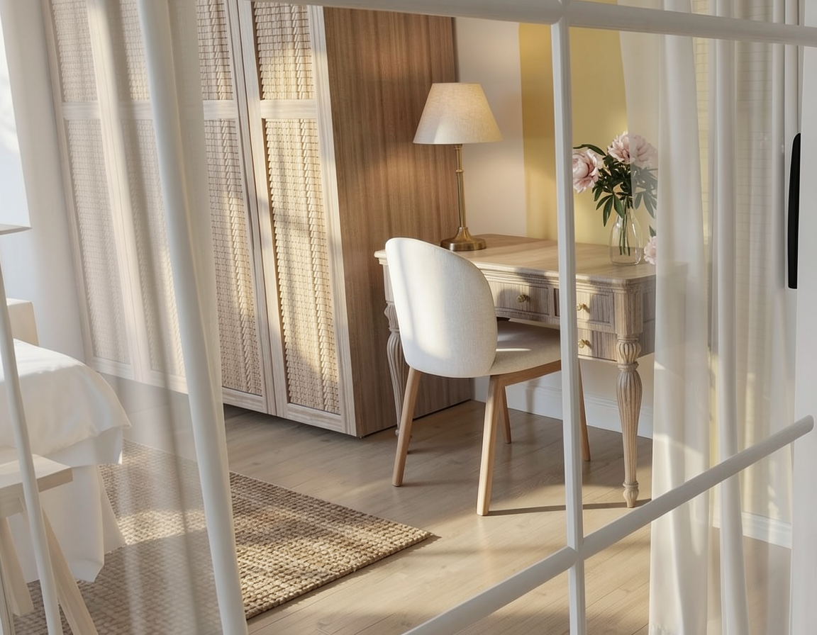 create a high end architectural interior realistic render calm and refined atmosphere soft natural daylight neutral warm palette balanced tones no orange cast diffused light with soft shadows subtle contrast natural color accuracy emphasis on materiality and texture tactile surfaces minimal styling clean architectural lines integrated design serene and timeless space depth and layering cinematic softness slightly desaturated tones photorealistic 35mm lens soft color grading quiet luxury emotional balance breathing space no harsh lighting no strong color cast no oversaturation maintain 100 of the geometry materials colours and layout with a sharp photorealistic result add more natural daylight most important materials concrete stucco warm grey ceramic tiles 90 x 90 cm fumed mirror glass open pore travertine titanium carpentry matt white add light in the spots in the ceiling indirect light indicated blue line replace this by led add some towels decoration in the open niche left ceiling walls matt white left wall between niche and glass fume gray mirror same as the cabinet central in the back left right from the niche