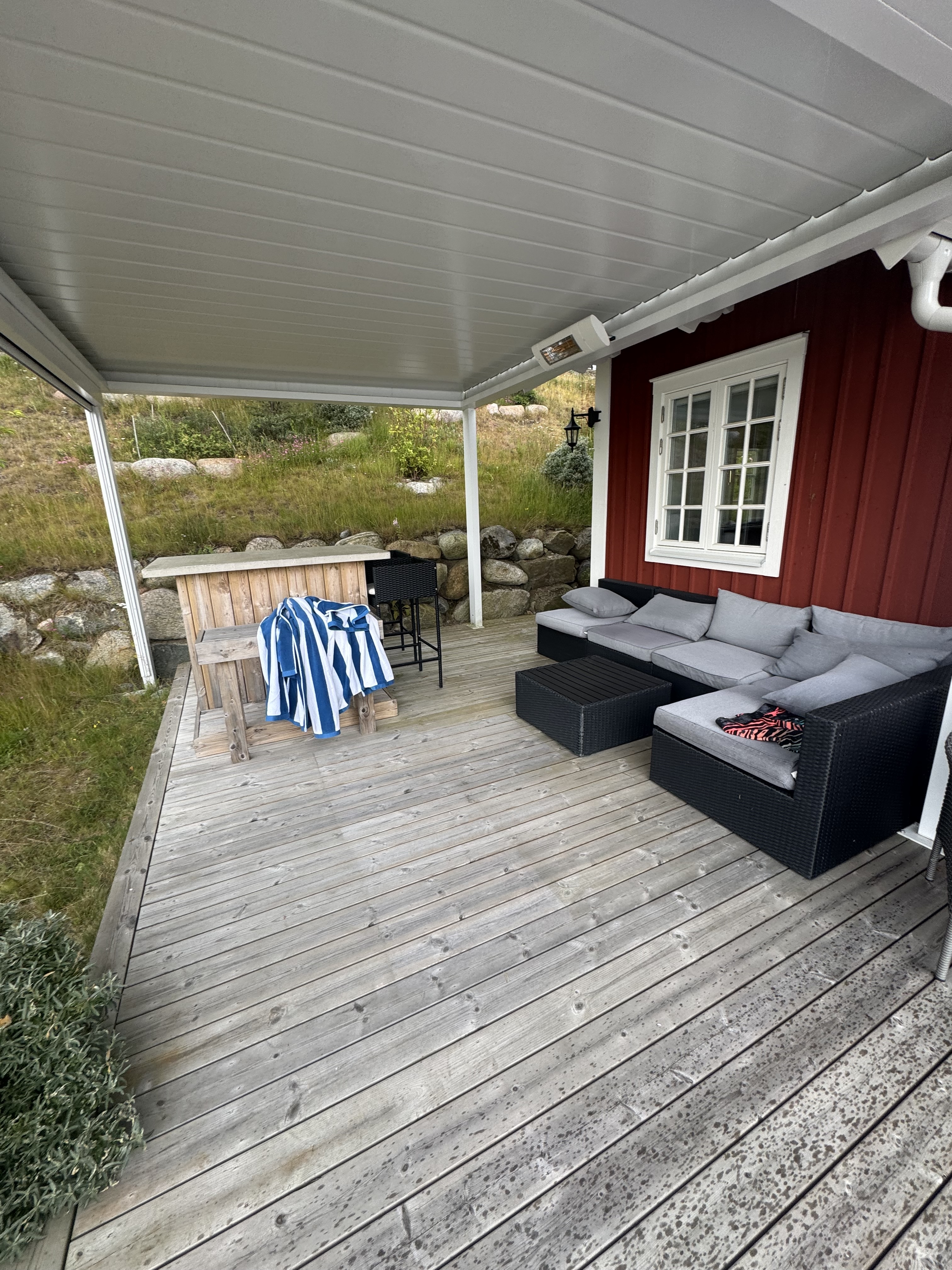 prompt english create a photorealistic rendering based on the uploaded image of a seaside terrace attached to a red wooden house with white details transform the terrace into a warm inviting summer setting with a refined scandinavian outdoor living aesthetic key changes to apply remove the existing white pergola structure entirely replace it with elegant freestanding parasols in a soft neutral tone linen or off white fabric positioned to create shade over the seating and bar area redesign the existing bar make the bar larger and more substantial with a more architectural and inviting presence use natural tactile materials such as light limestone travertine or textured concrete for the countertop consider vertical cladding in wood slats or subtle tiles inspired by the reference images integrate a footrest and create a proper social bar setting place outdoor furniture from the moodboard a 3 seat sofa and matching armchair in woven natural fibers with soft neutral cushions a low coffee table teak or light wood with metal base two poufs in a textured light neutral fabric bar stools with a refined contemporary design wood or black metal woven seat placed around the bar styling atmosphere create a sunny late afternoon summer light with soft shadows add subtle styling linen cushions a light throw glassware and a few decorative objects on the table and bar include greenery in a restrained way potted plants soft grasses that complements the coastal surroundings keep the existing architecture red facade white window wooden deck but enhance the warmth and cohesion of the space overall feeling effortless elegant and inviting a high end scandinavian summer house terrace designed for relaxed social gatherings by the water