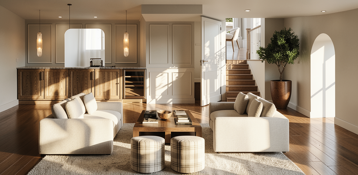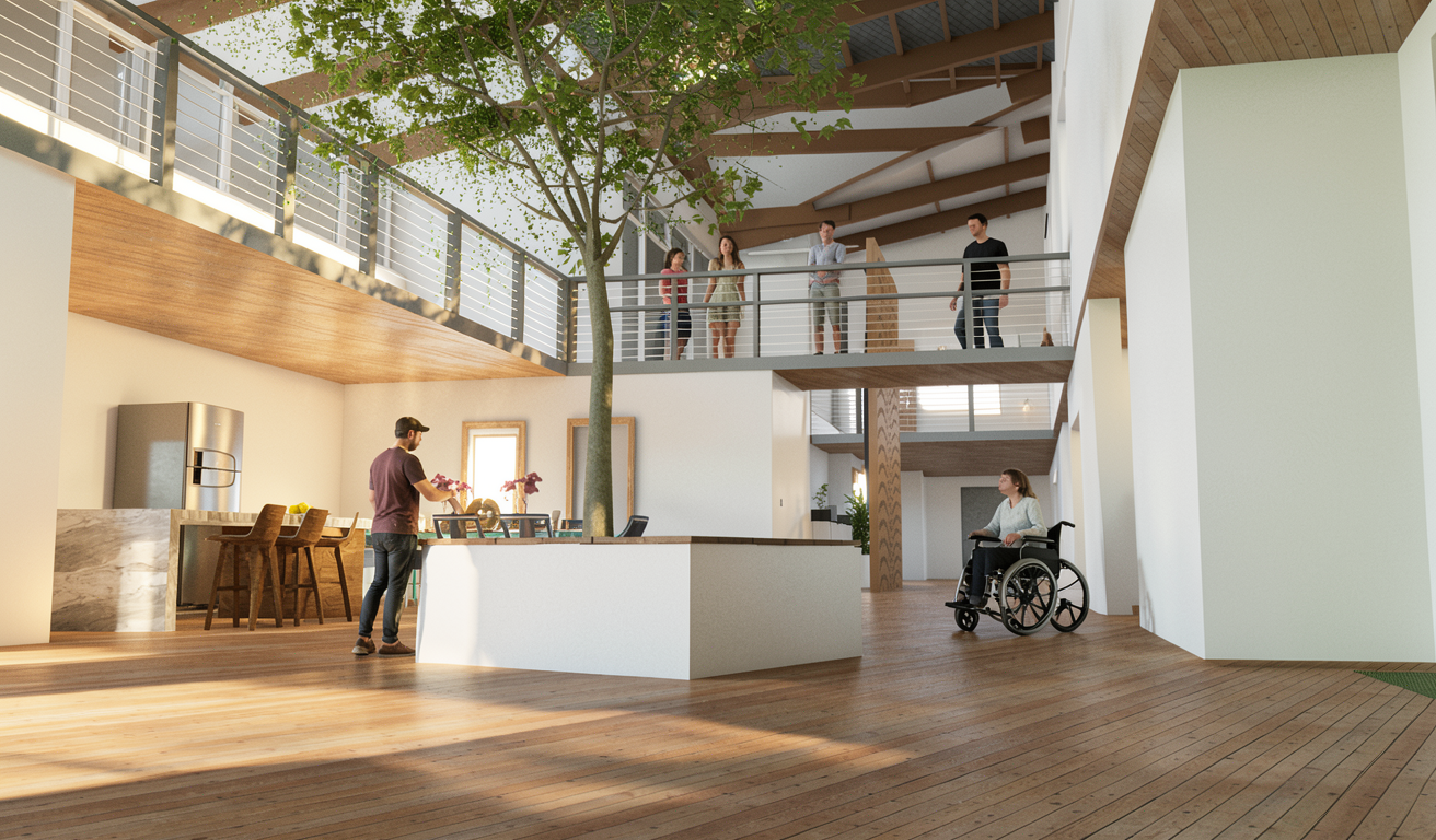 modernist exterior shot add car parked in the front of each door make it a minimalist tropical design add people make it symmetrical for all units architecture