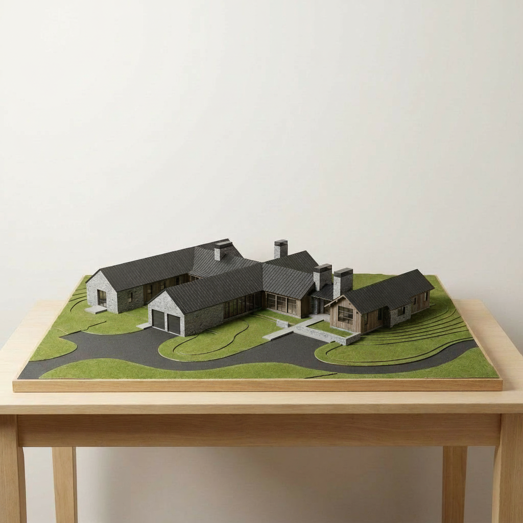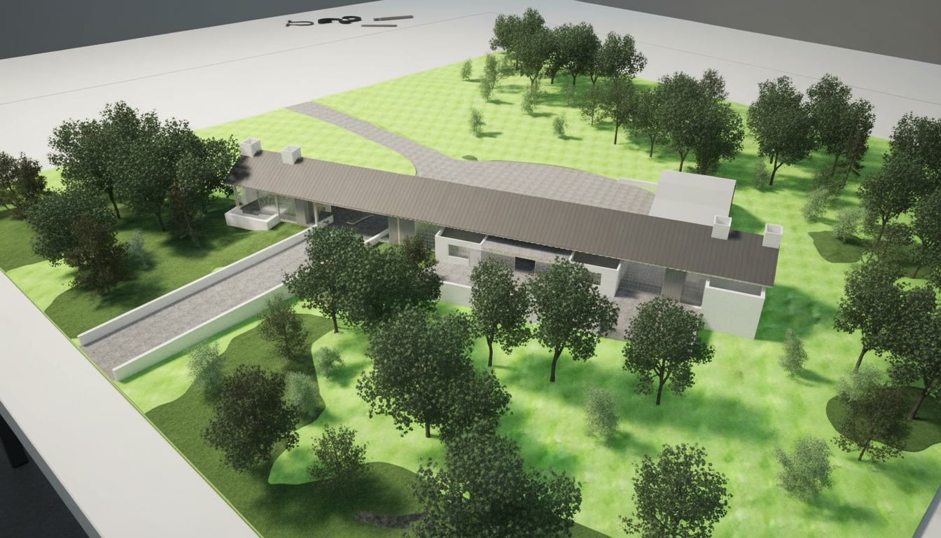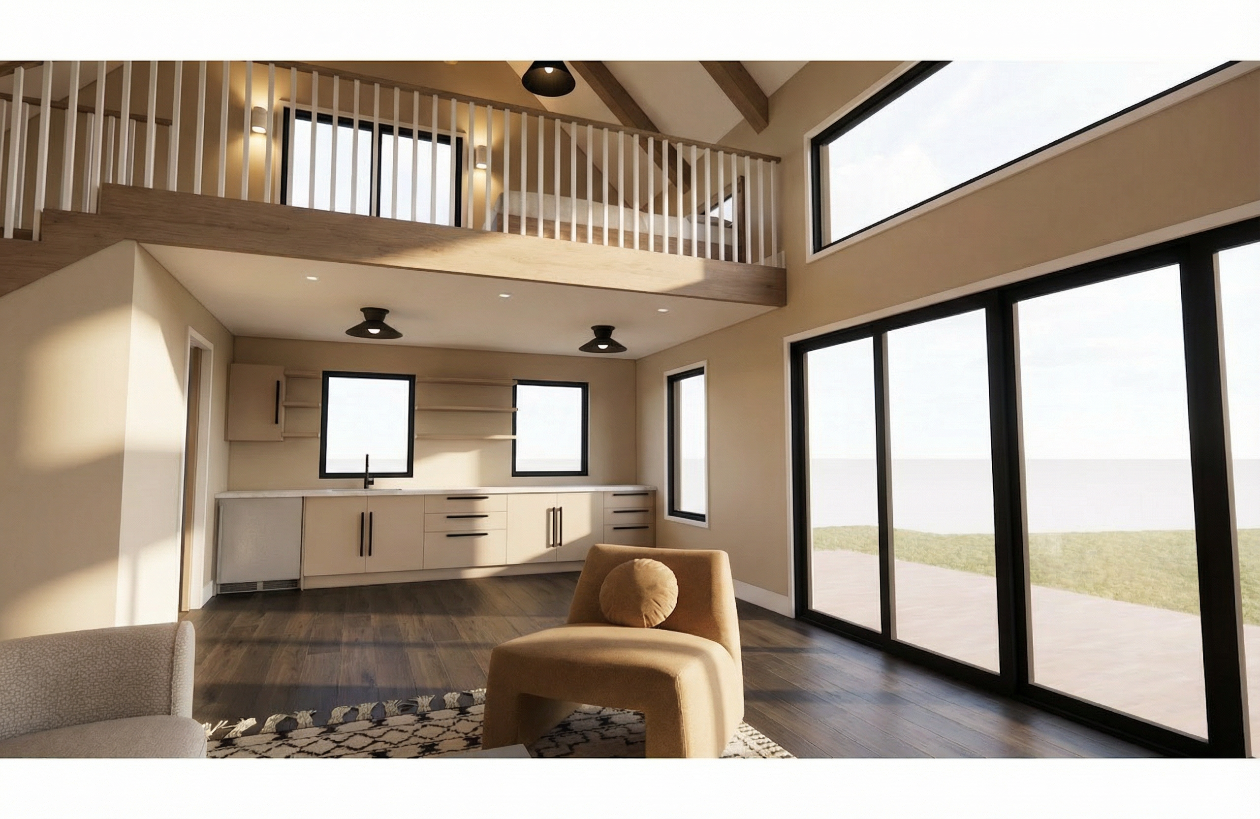 a modern luxurious kitchen with a serene and sophisticated atmosphere the room features sleek grey oak cabinetry with flutted travertine curved cabinets and a large island centerpiece made natural traavertine romano the walls are clad in a soft cashmere hue with panelling complementing the cabinetry appliances are seamlessly integrated adding a touch of contrast overhead lighting is warm and ambient creating a cozy yet refined ambiance the flooring is parquet enhancing the airy feel of the space sparse greenery adds a hint of freshness while maintaining the minimalistic and clean design outdoor light from the right hand side window view is of luxury villa style