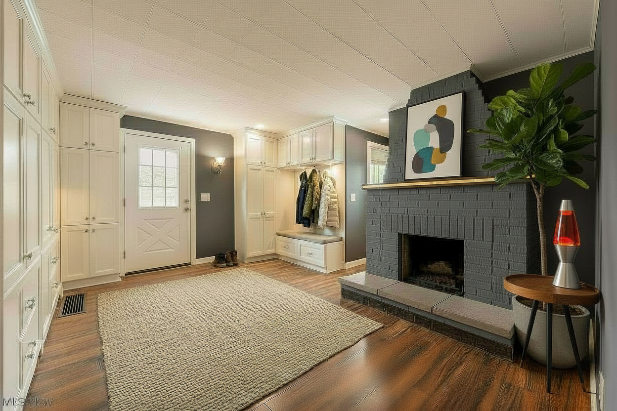 make floor wood and ceiling with some people looking out and in the building