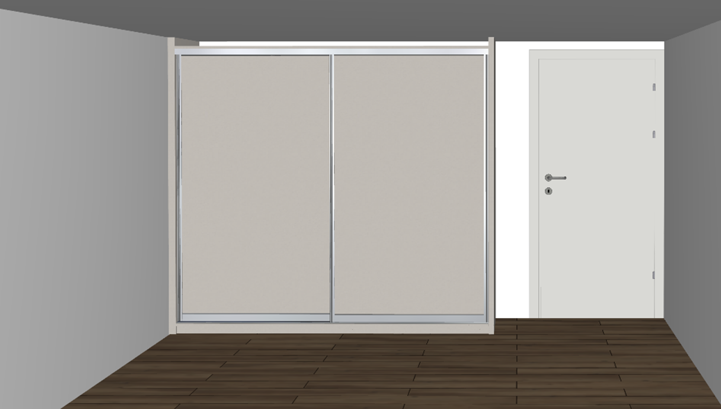a modern minimalist interior room featuring a large sliding wardrobe and a door the wardrobe has sleek silver frames with soft beige panels creating a clean and contemporary design the walls are a soothing light gray while the ceiling is a darker gray adding depth to the space the floor is rich dark brown wood adding warmth and contrast to the room the door is painted in a clean crisp white with a modern silver handle the overall atmosphere is calm elegant and modern with a focus on simplicity and sophistication the lighting is soft and ambient highlighting the smooth lines and textures
