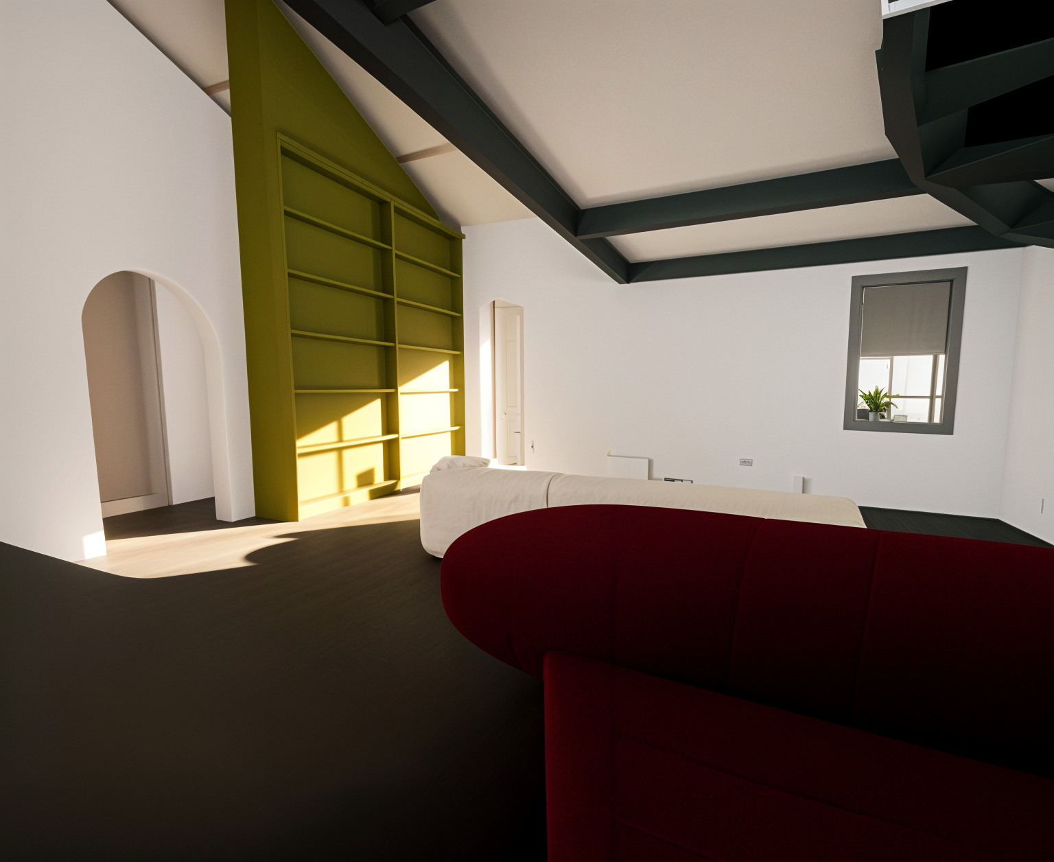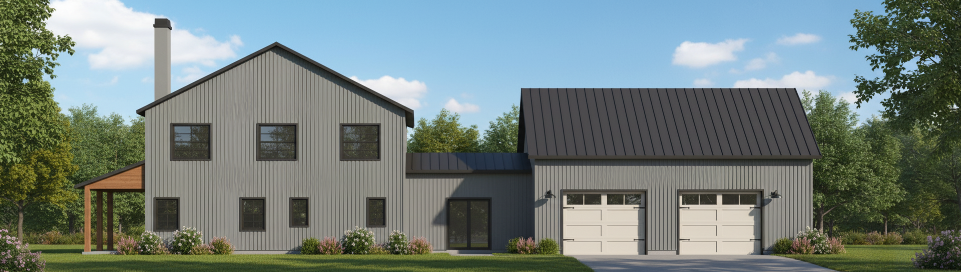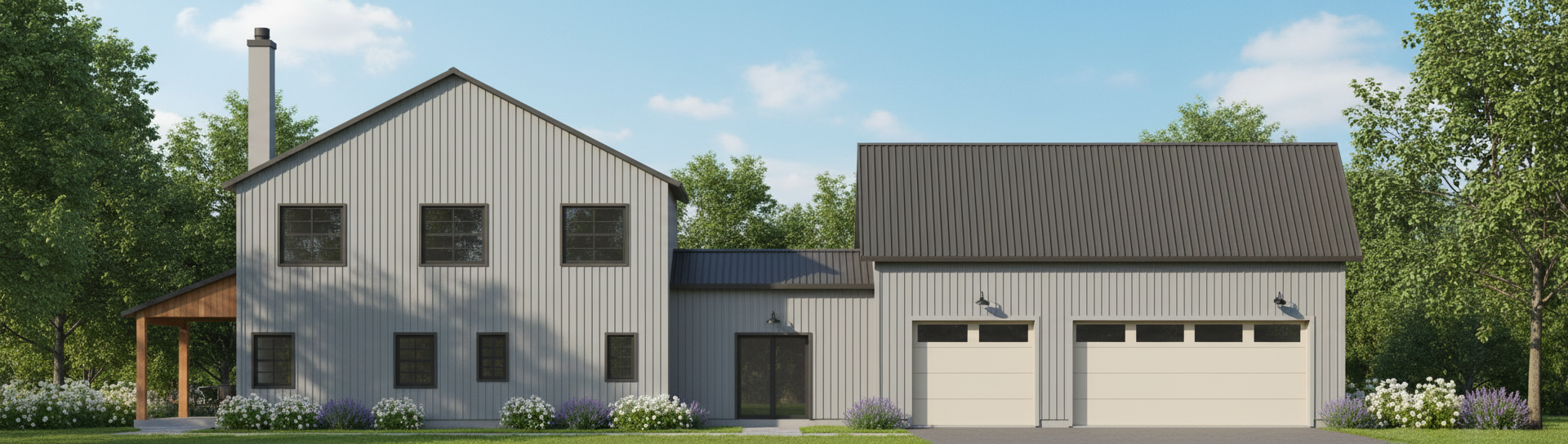 render a modern farmhouse with an atmospheric touch the house has a light gray exterior with subtle vertical paneling the roof is a dark slate gray creating a bold contrast large windows are framed in charcoal black adding an elegant touch the garage doors are a soft cream inviting and warm the porch posts are a natural wood tone adding rustic charm surround the house with soft ambient lighting and a clear sky to enhance the serene welcoming atmosphere