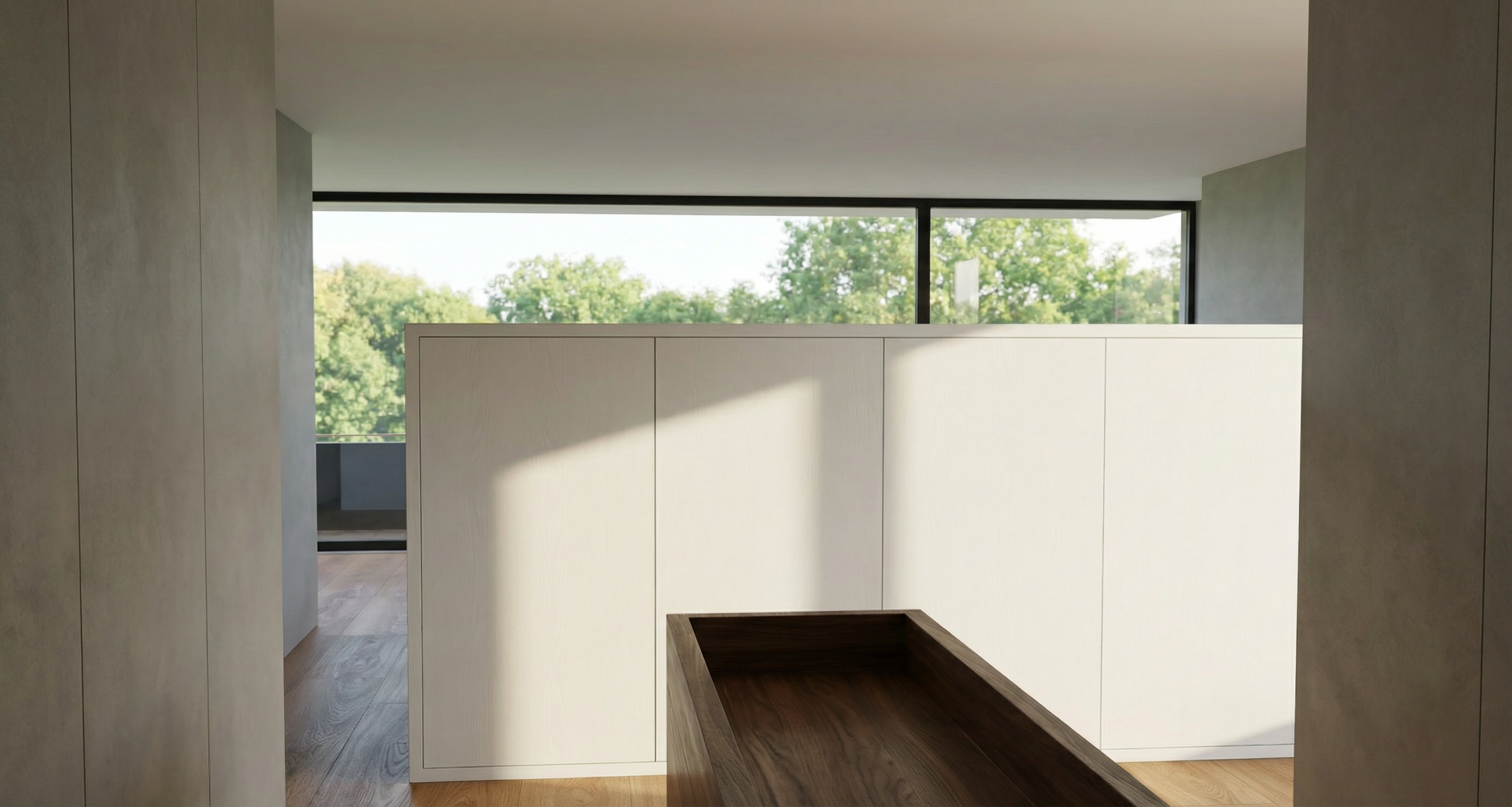 concrete floor black frostet mosaic tiles half hight on the walls walls white frostet surfaces floor without cracks ceiling with wooden beams